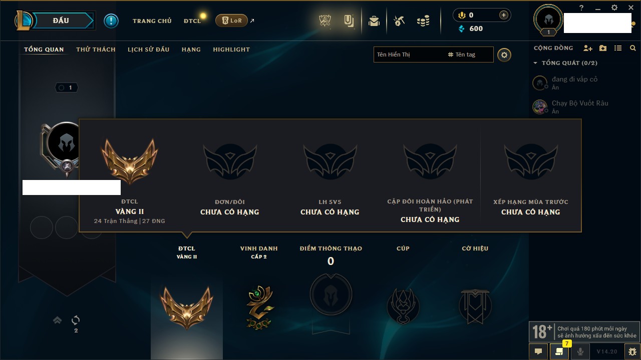 Rank Đơn: Chưa rank mùa nàoKhung: Chưa có khungTướng: 0 - Còn 6300 THXTrang Phục: 0Rank ĐTCL: Bạc IIILinh Thú: 3