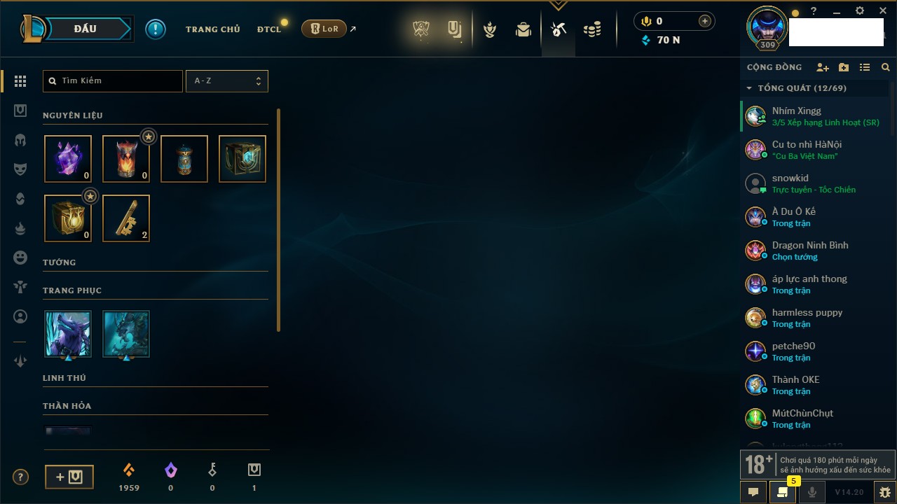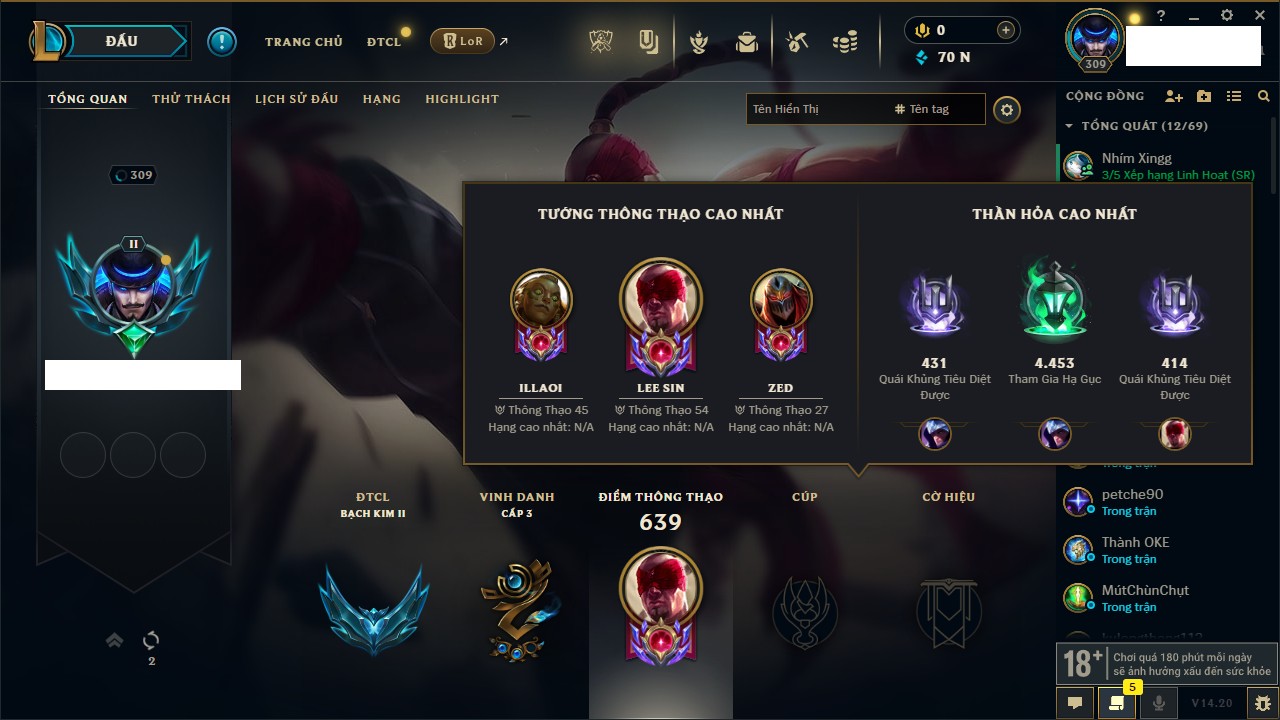 Rank Đơn: Chưa rank mùa nào Khung: Chưa có khung Tướng: 0 - Còn 2000 THX Trang Phục: 0 Rank ĐTCL: Chưa Rank Linh Thú: 14