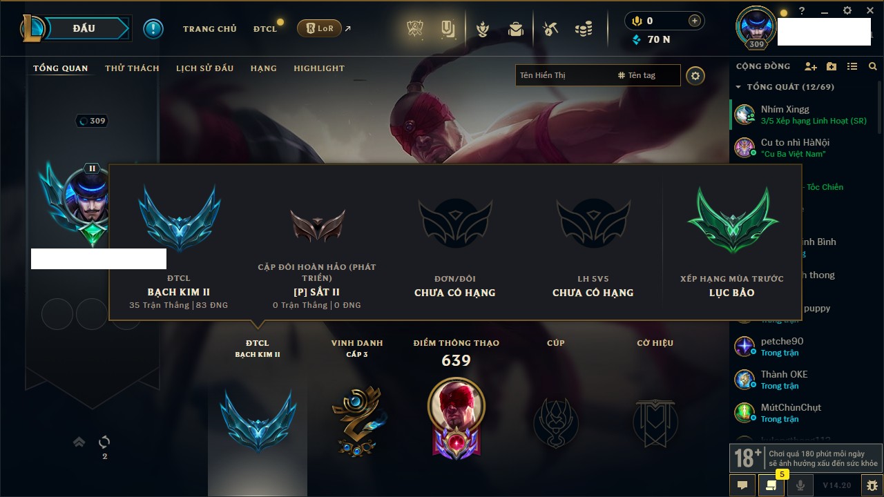 Rank Đơn: Bạc IV Khung: Bạc Tướng: 64 - Còn 5901 THX Trang Phục: 17 Rank ĐTCL: Chưa Rank Linh Thú: 105