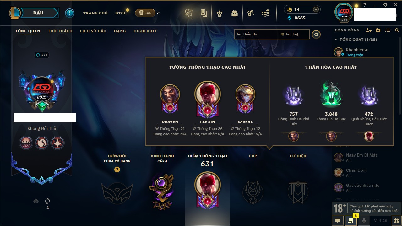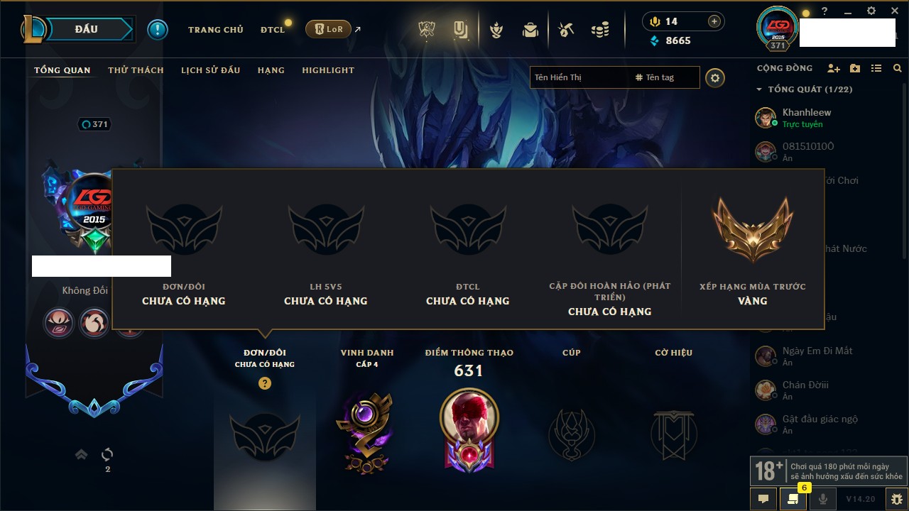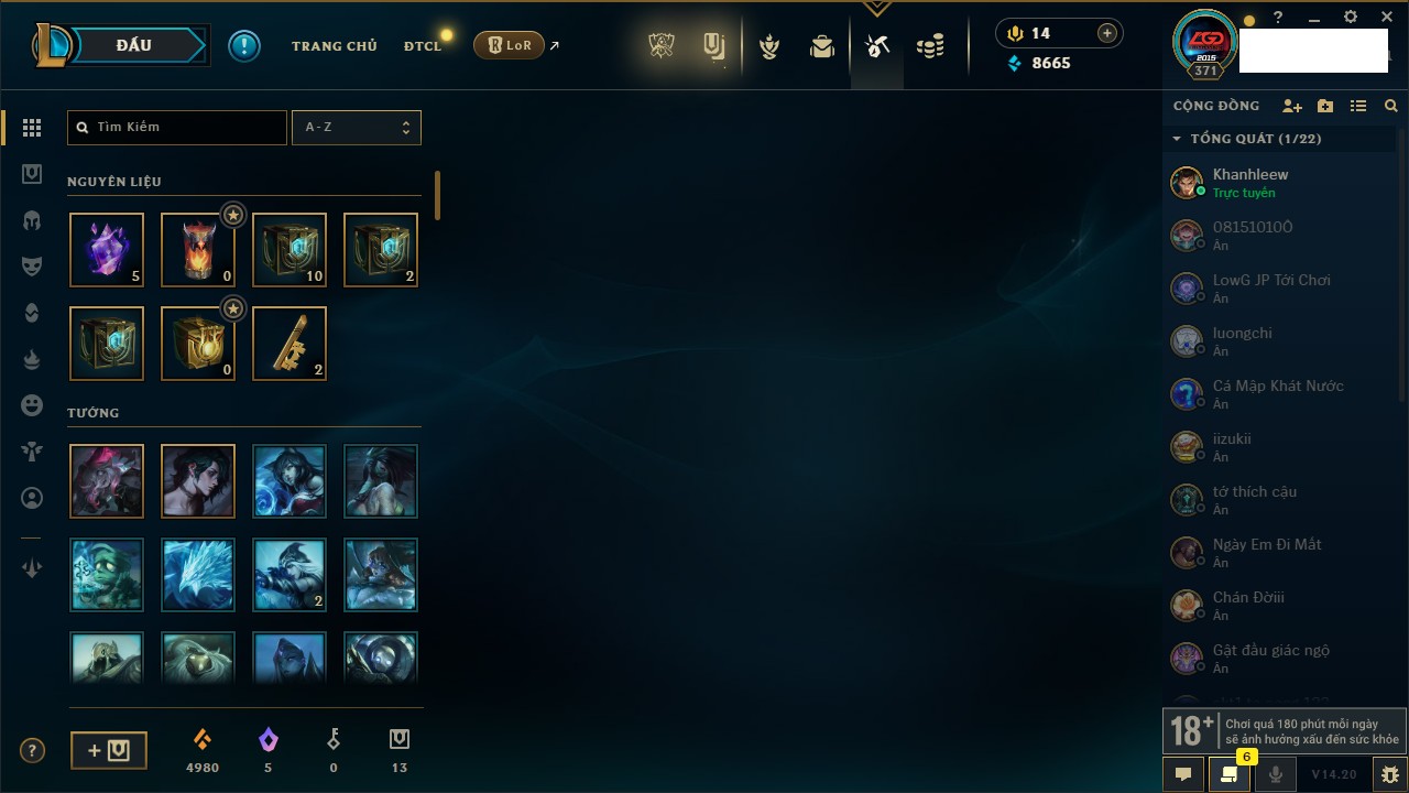 Rank Đơn: Vàng IIIKhung: BạcTướng: 171 - Còn 101359 THXTrang Phục: 88Rank ĐTCL: Kim Cương IVLinh Thú: 200