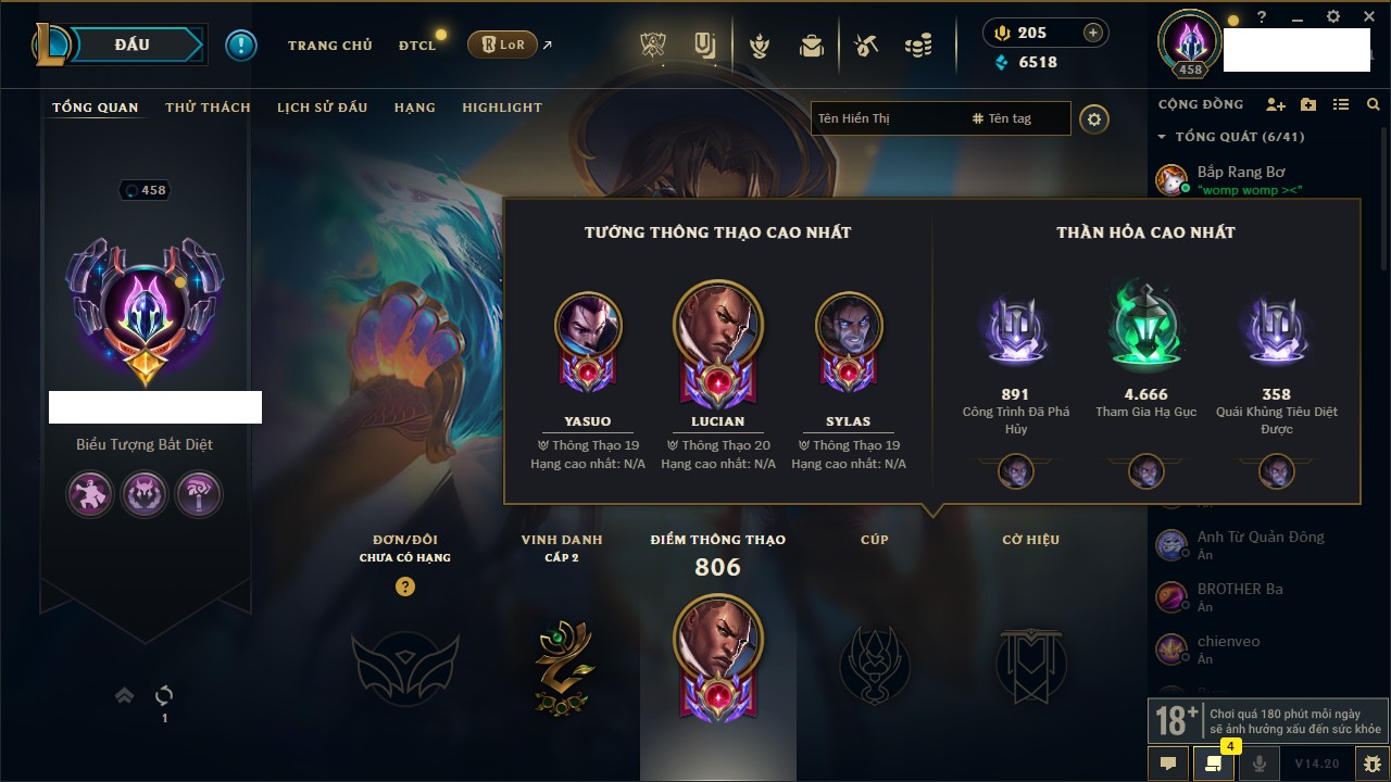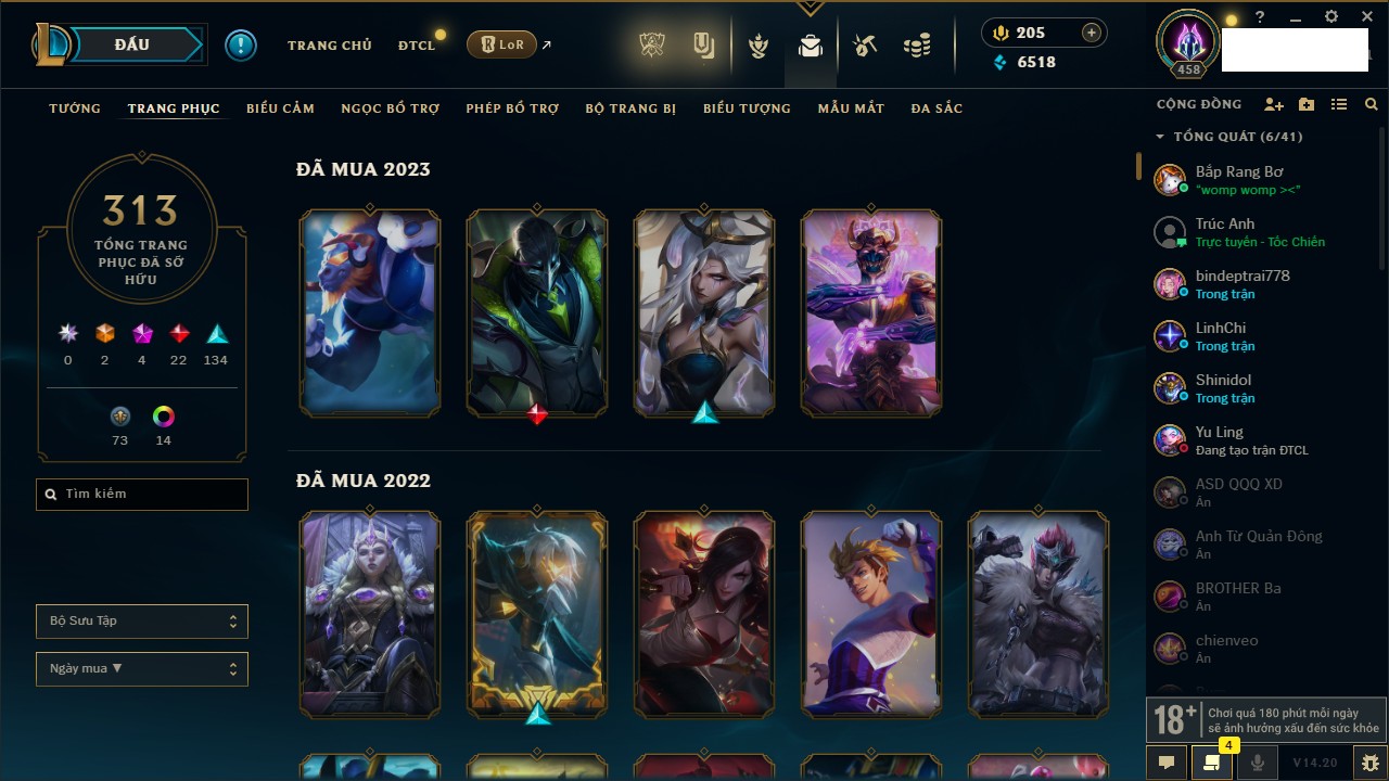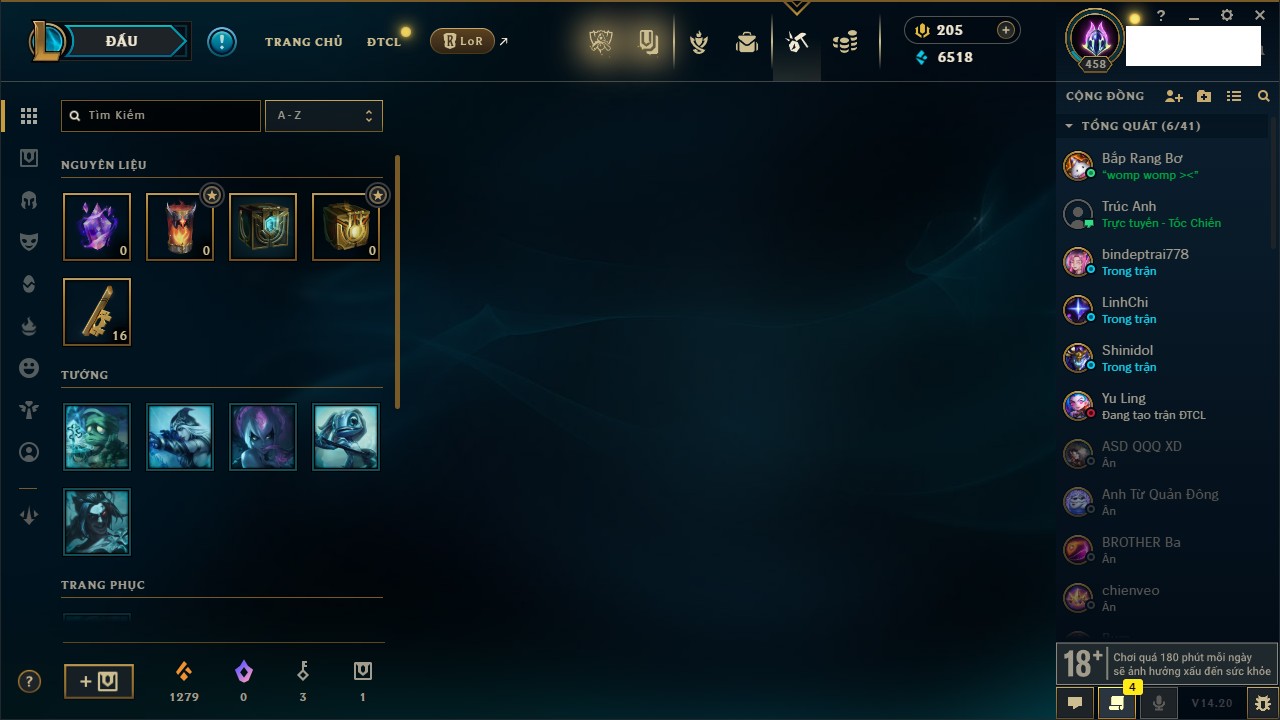 Rank Đơn: Vàng IKhung: BạcTướng: 171 - Còn 60584 THXTrang Phục: 286Rank ĐTCL: Vàng IIILinh Thú: 117