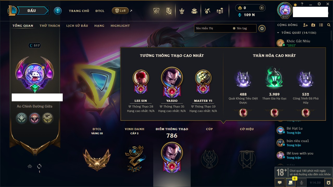 Rank Đơn: Đồng IIKhung: ĐồngTướng: 170 - Còn 66145 THXTrang Phục: 215Rank ĐTCL: Chưa RankLinh Thú: 52