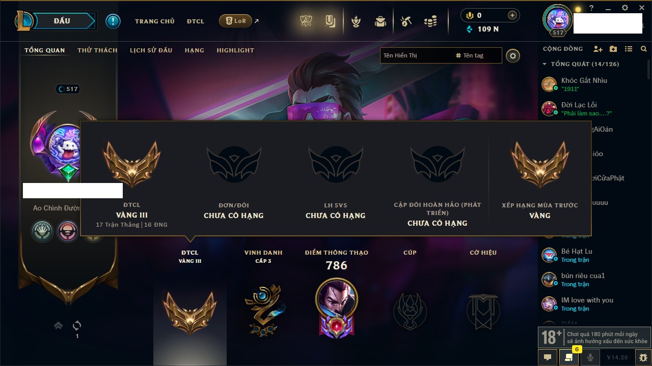 Rank Đơn: Vàng IIIKhung: BạcTướng: 171 - Còn 101359 THXTrang Phục: 88Rank ĐTCL: Kim Cương IVLinh Thú: 200