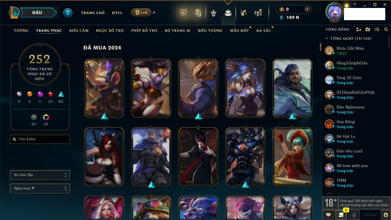 Rank Đơn: Đồng IKhung: ĐồngTướng: 168 - Còn 11447 THXTrang Phục: 245Rank ĐTCL: Chưa RankLinh Thú: 53