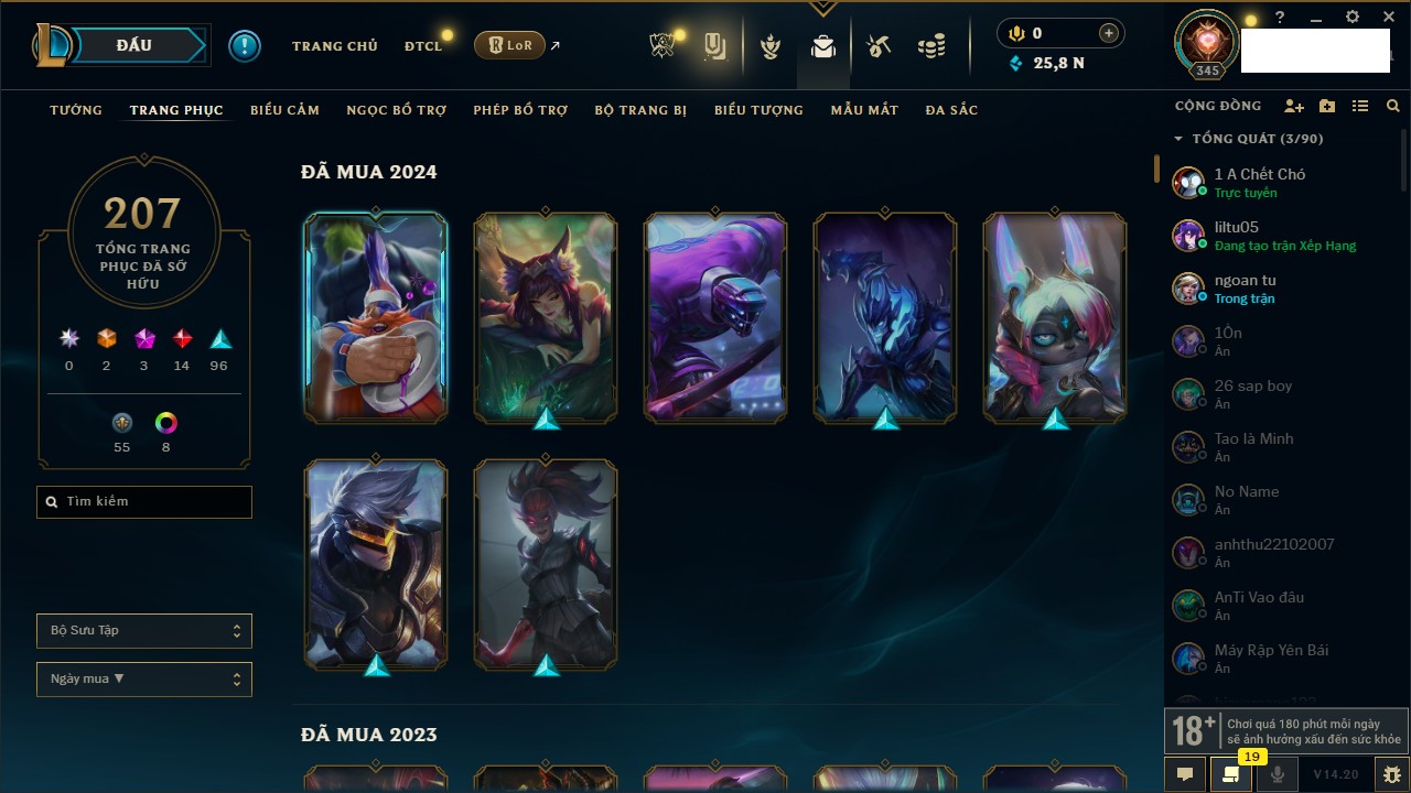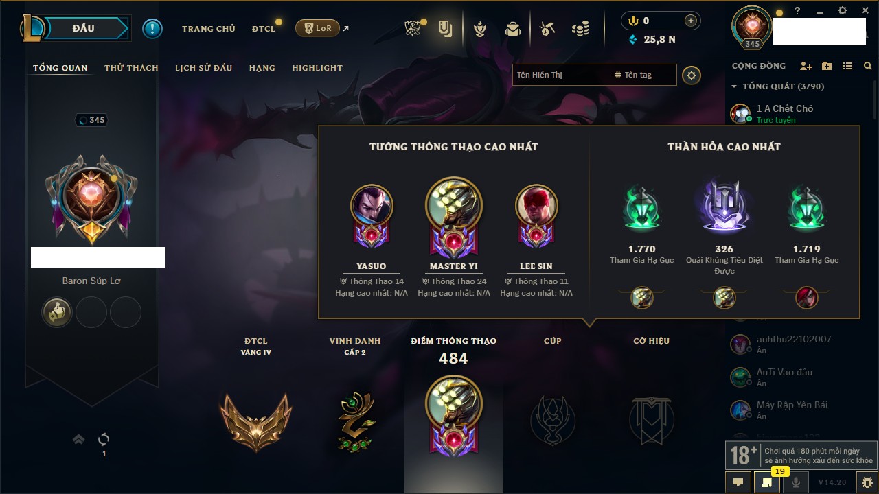 Rank Đơn: Vàng IVKhung: BạcTướng: 166 - Còn 180925 THXTrang Phục: 163Rank ĐTCL: Chưa RankLinh Thú: 67