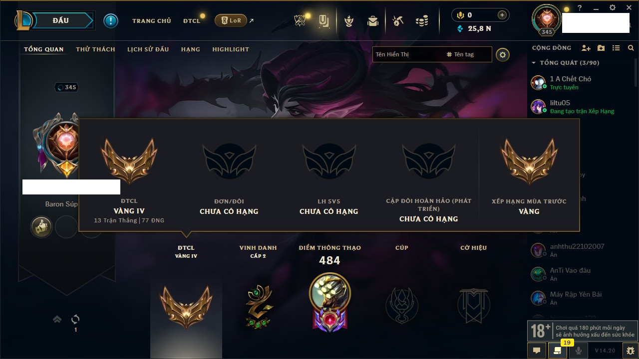 Rank Đơn: Bạc IIKhung: VàngTướng: 171 - Còn 332462 THXTrang Phục: 165Rank ĐTCL: Kim Cương IVLinh Thú: 181
