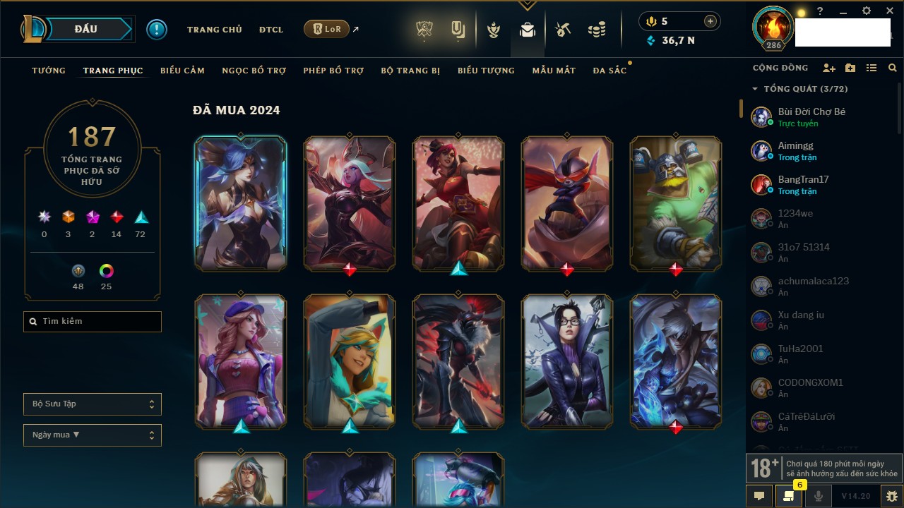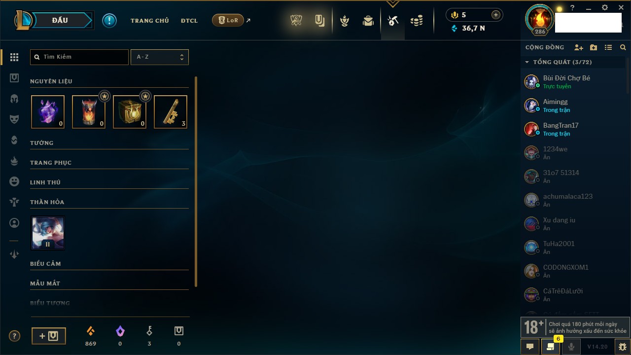 Rank Đơn: Đồng IIKhung: Chưa có khungTướng: 170 - Còn 56487 THXTrang Phục: 90Rank ĐTCL: Chưa RankLinh Thú: 129