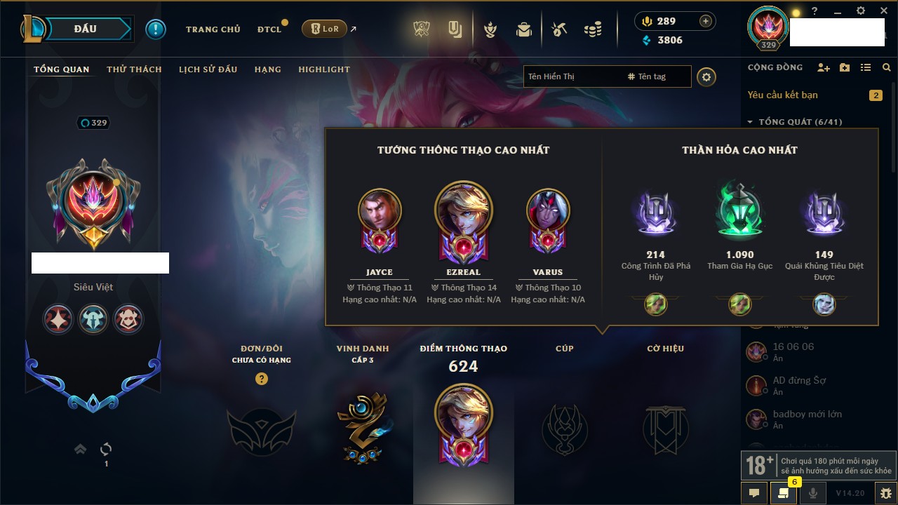 Rank Đơn: Chưa RankKhung: Chưa có khungTướng: 157 - Còn 6783 THXTrang Phục: 50Rank ĐTCL: Chưa RankLinh Thú: 37