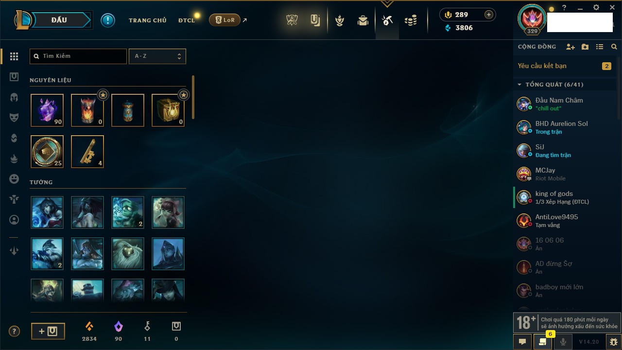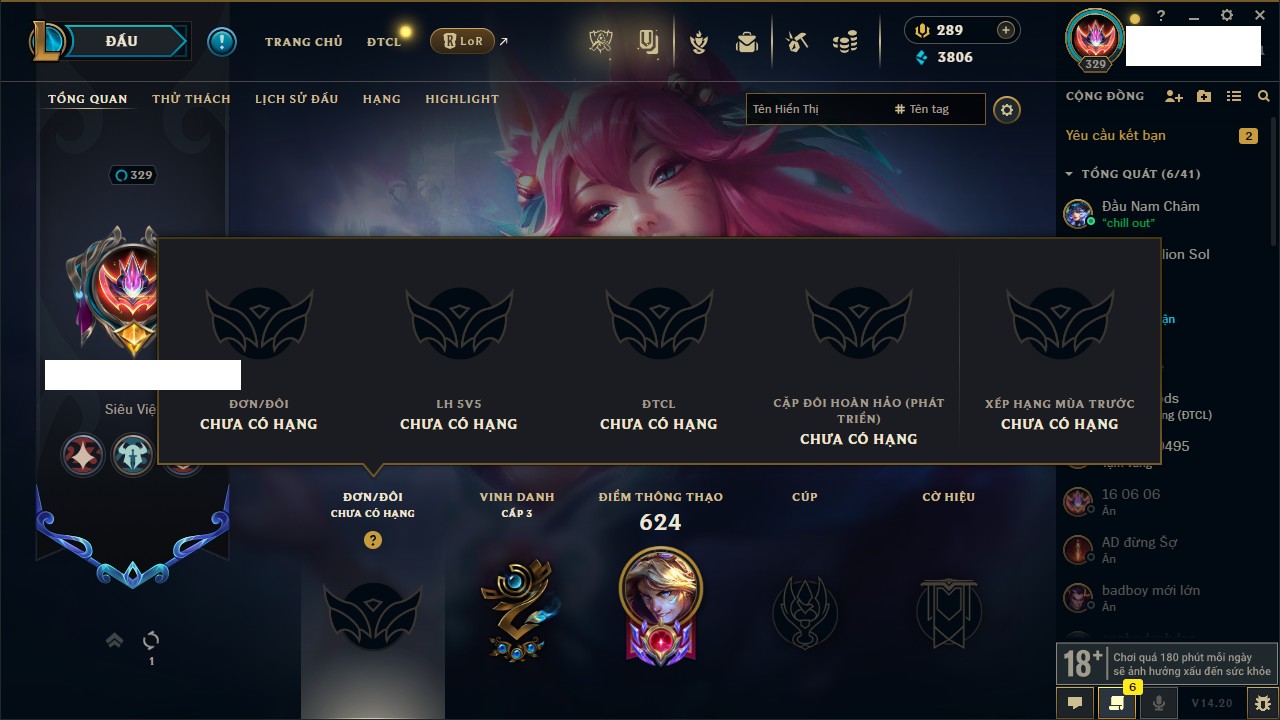 Rank Đơn: Vàng IVKhung: VàngTướng: 146 - Còn 89110 THXTrang Phục: 63Rank ĐTCL: Vàng IIILinh Thú: 41