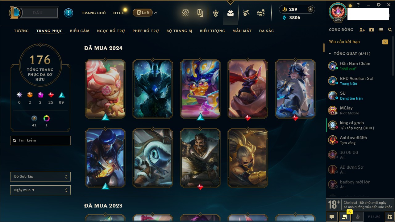 Rank Đơn: Vàng IIIKhung: VàngTướng: 170 - Còn 33222 THXTrang Phục: 136Rank ĐTCL: Chưa RankLinh Thú: 40