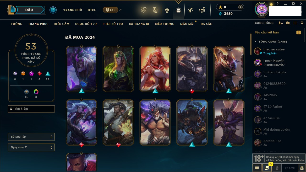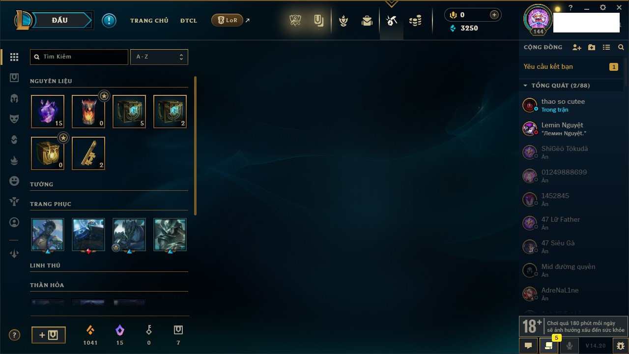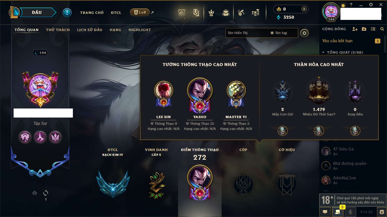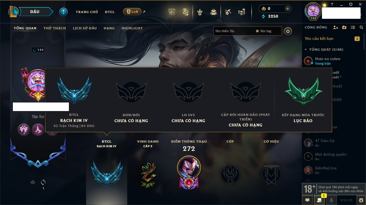 Rank Đơn: Bạch Kim IIKhung: Bạch kimTướng: 171 - Còn 316137 THXTrang Phục: 89Rank ĐTCL: Bạch Kim IIILinh Thú: 94