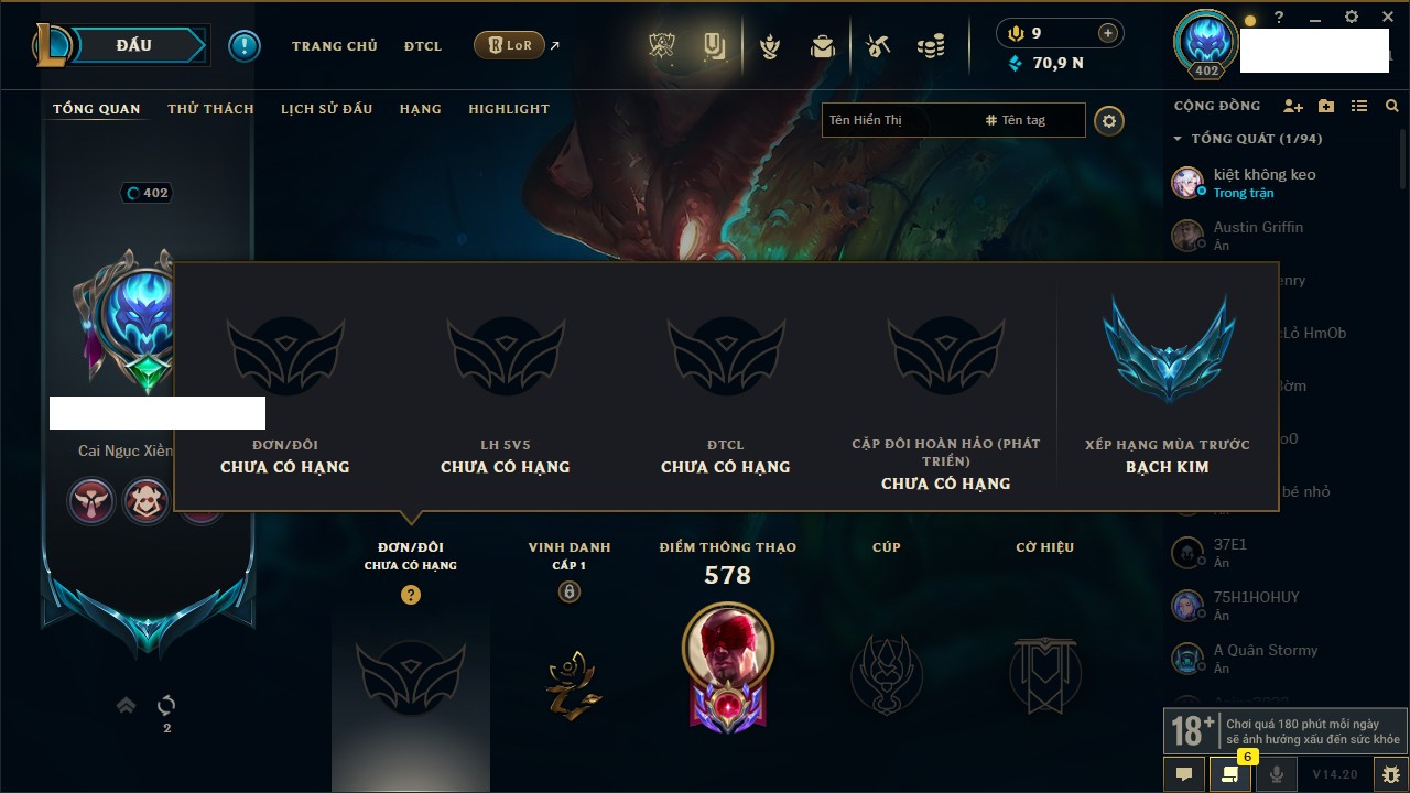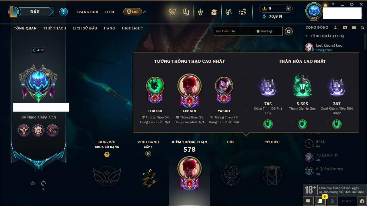 Rank Đơn: Đồng IKhung: Chưa có khungTướng: 130 - Còn 4038 THXTrang Phục: 151Rank ĐTCL: Chưa RankLinh Thú: 45
