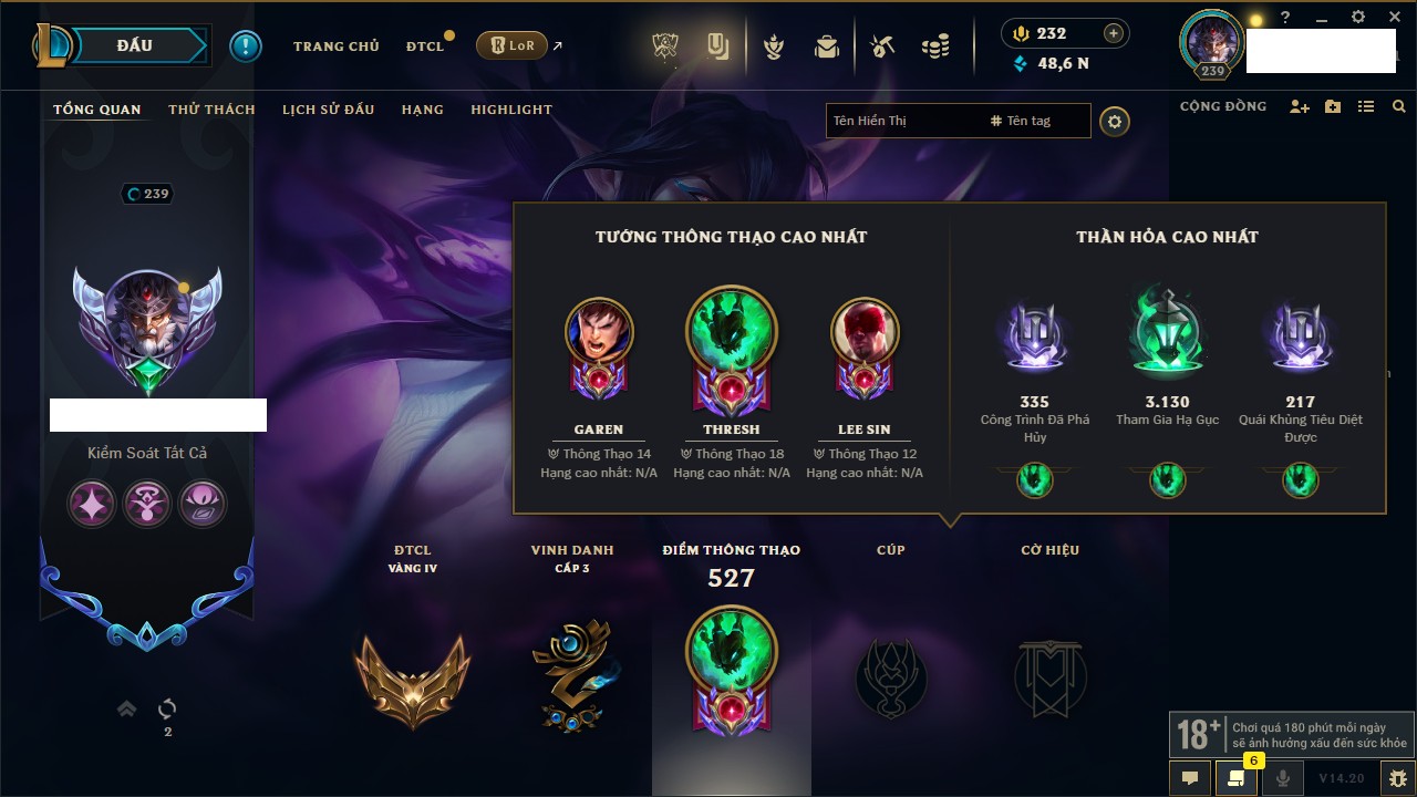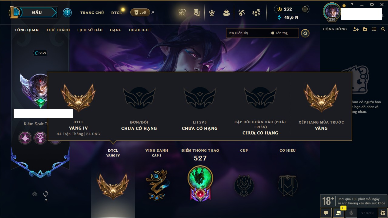 Rank Đơn: Chưa RankKhung: SắtTướng: 140 - Còn 610 THXTrang Phục: 110Rank ĐTCL: Chưa RankLinh Thú: 162