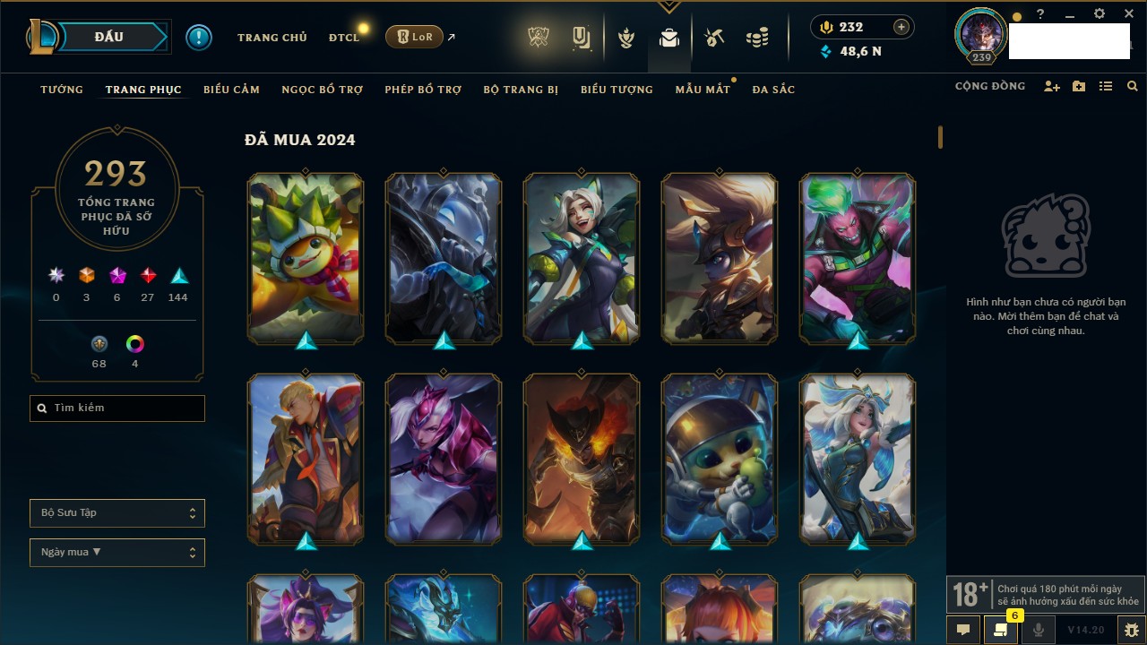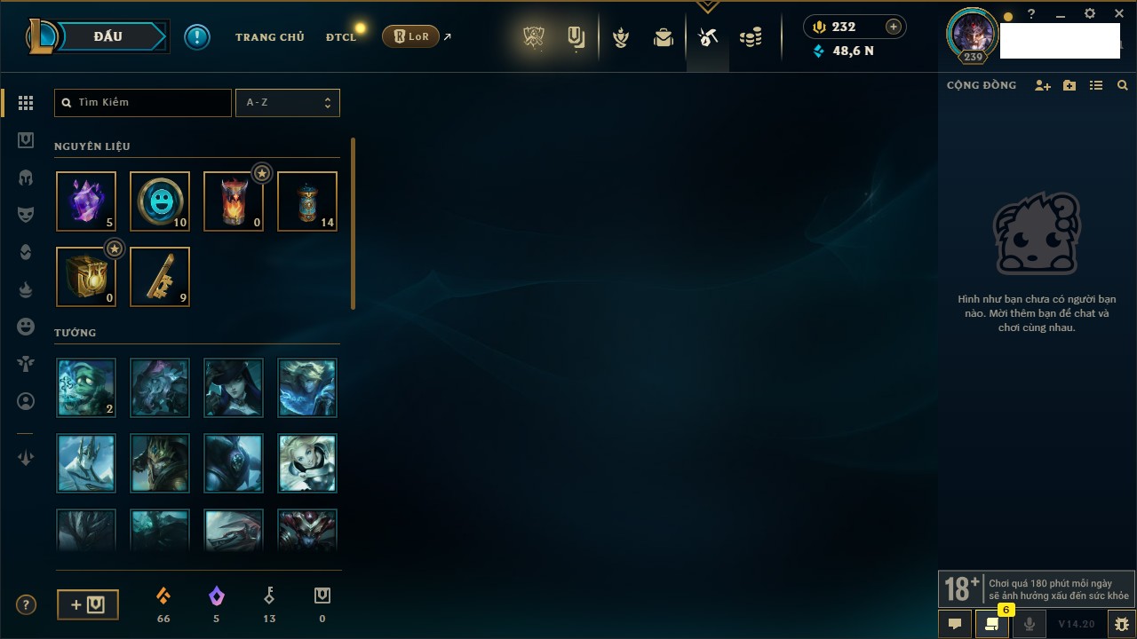 Rank Đơn: Chưa RankKhung: Bạch kimTướng: 171 - Còn 182788 THXTrang Phục: 158Rank ĐTCL: Chưa RankLinh Thú: 56
