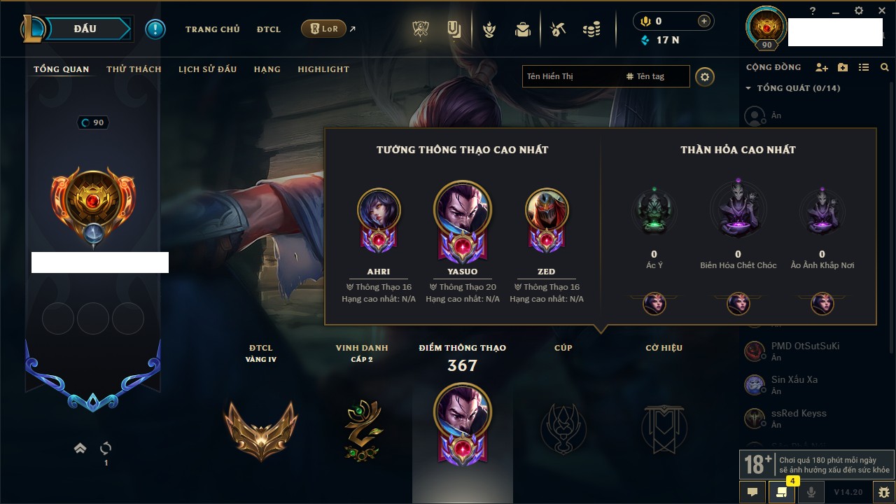 Rank Đơn: Chưa Rank Khung: Vàng Tướng: 171 - Còn 140250 THX Trang Phục: 80 Rank ĐTCL: Chưa Rank Linh Thú: 68