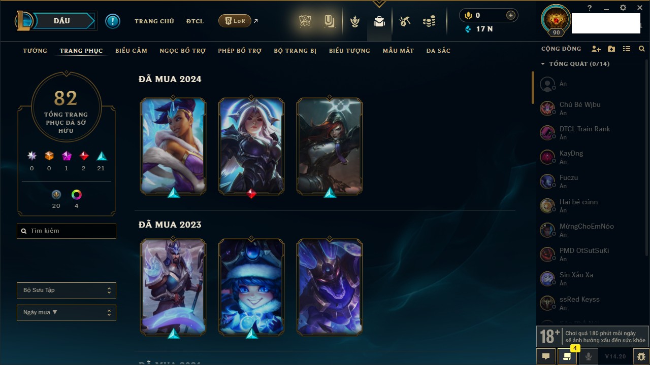 Rank Đơn: Chưa Rank Khung: Chưa có khung Tướng: 171 - Còn 52162 THX Trang Phục: 78 Rank ĐTCL: Chưa Rank Linh Thú: 145