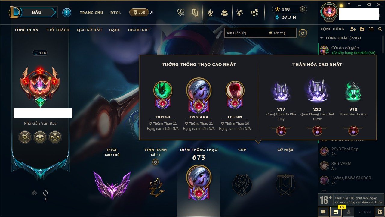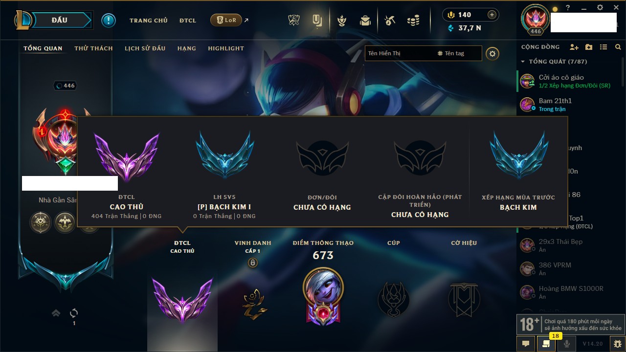 Rank Đơn: Vàng IKhung: Bạch kimTướng: 170 - Còn 212450 THXTrang Phục: 214Rank ĐTCL: Bạch Kim IVLinh Thú: 221