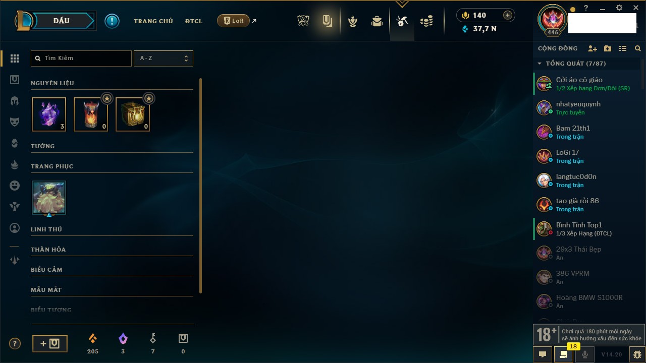 Rank Đơn: Đồng IIIKhung: ĐồngTướng: 170 - Còn 48082 THXTrang Phục: 272Rank ĐTCL: Chưa RankLinh Thú: 84