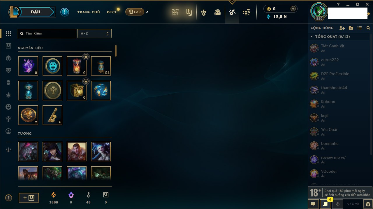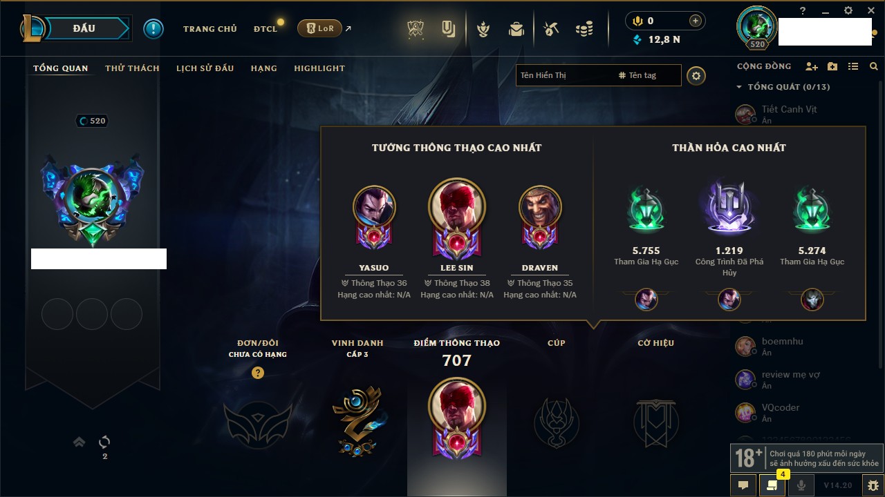 Rank Đơn: Vàng IVKhung: VàngTướng: 171 - Còn 48721 THXTrang Phục: 171Rank ĐTCL: Chưa RankLinh Thú: 27
