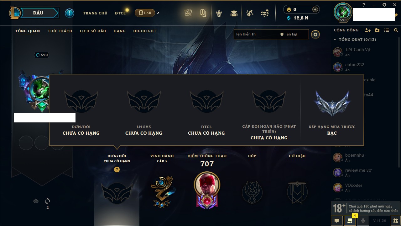 Rank Đơn: Bạc IIKhung: VàngTướng: 171 - Còn 332462 THXTrang Phục: 165Rank ĐTCL: Kim Cương IVLinh Thú: 181