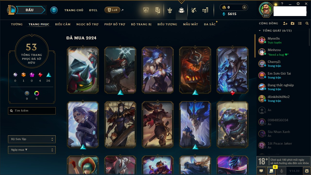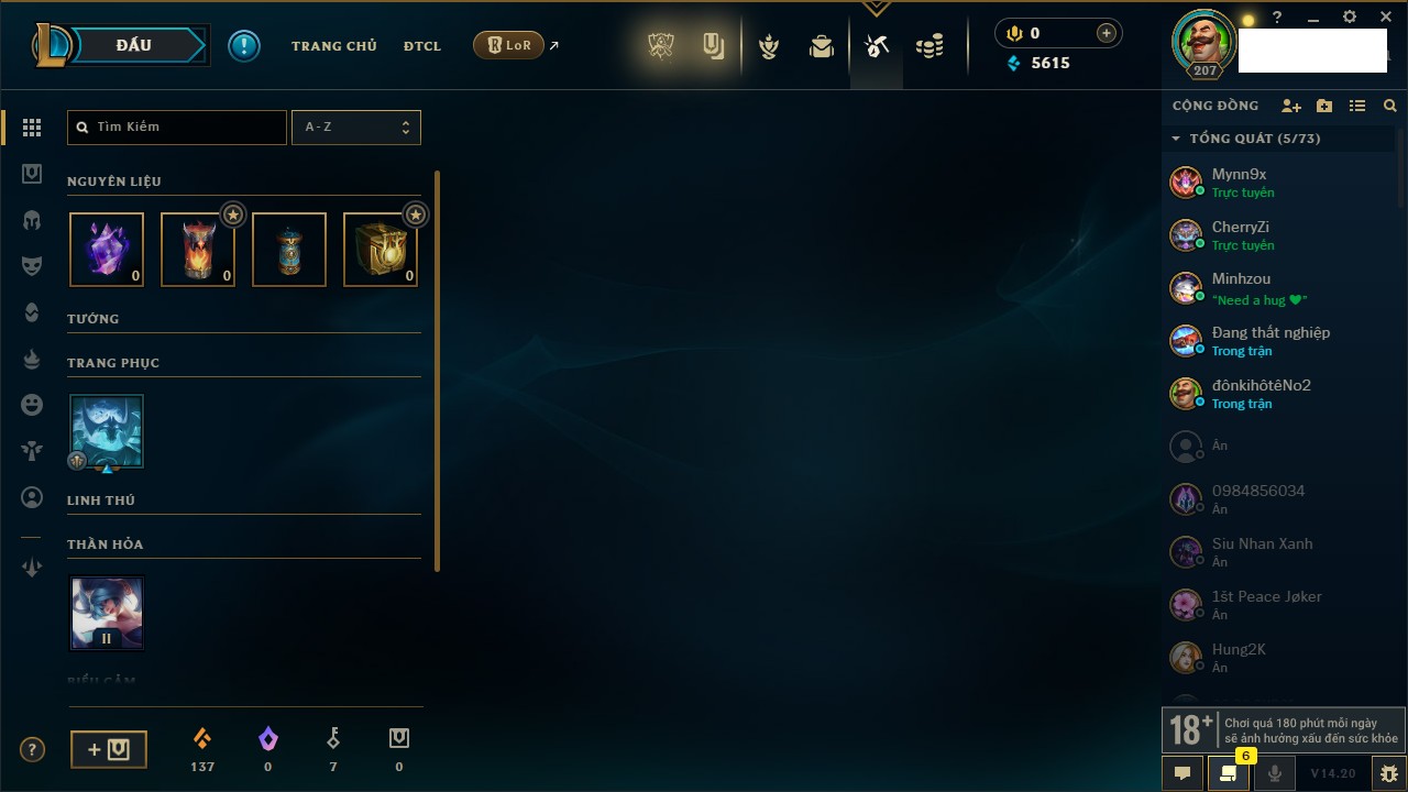Rank Đơn: Đồng IVKhung: Chưa có khungTướng: 140 - Còn 10800 THXTrang Phục: 19Rank ĐTCL: Chưa RankLinh Thú: 119