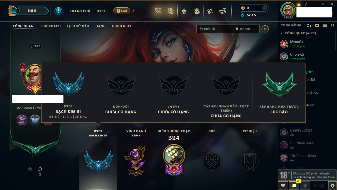 Rank Đơn: Vàng IIIKhung: BạcTướng: 103 - Còn 10252 THXTrang Phục: 7Rank ĐTCL: Chưa RankLinh Thú: 35