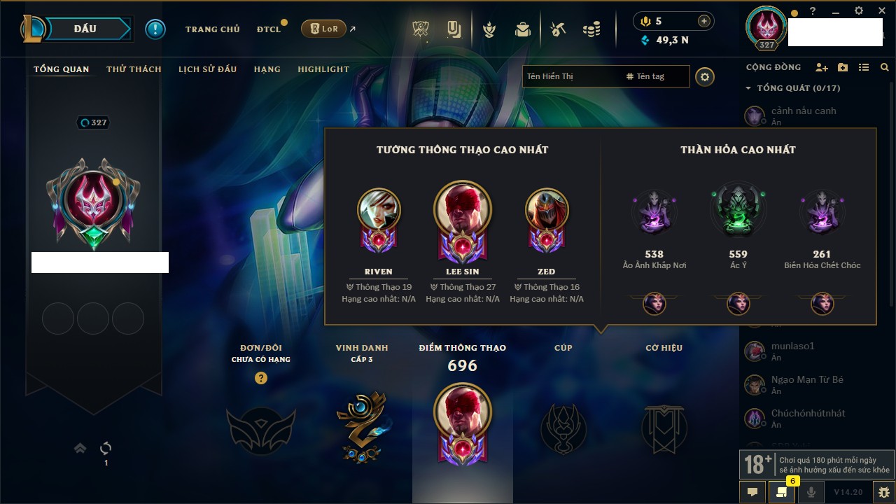 Rank Đơn: Sắt IKhung: SắtTướng: 171 - Còn 125789 THXTrang Phục: 151Rank ĐTCL: Đồng IIILinh Thú: 72