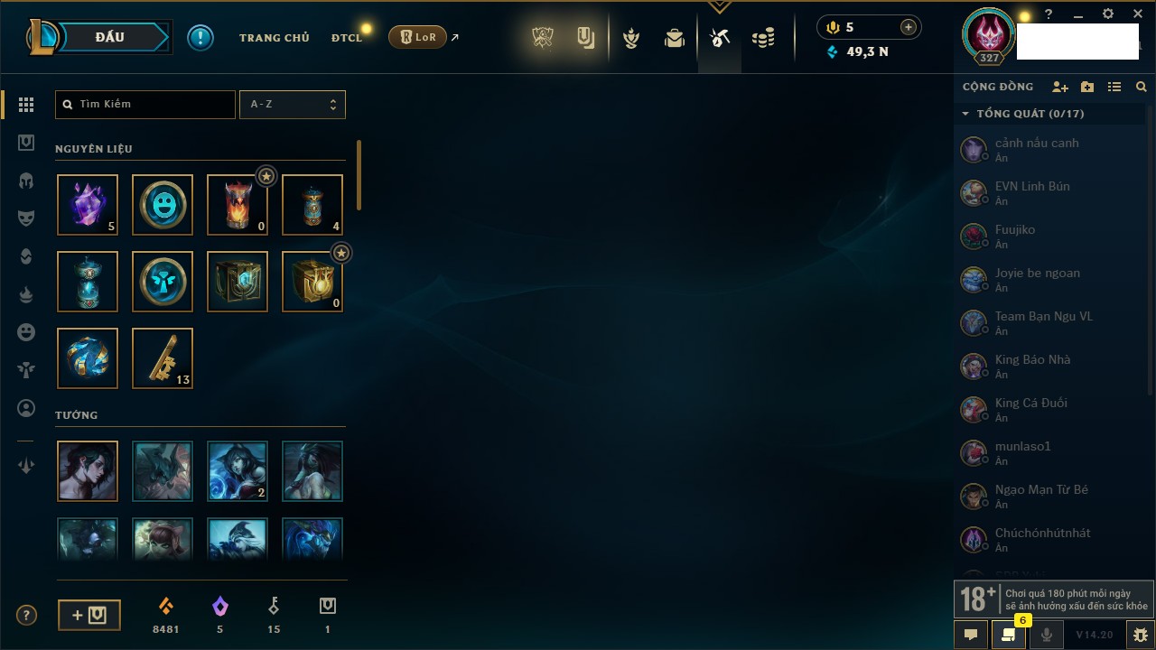 Rank Đơn: Vàng IVKhung: VàngTướng: 171 - Còn 48721 THXTrang Phục: 171Rank ĐTCL: Chưa RankLinh Thú: 27