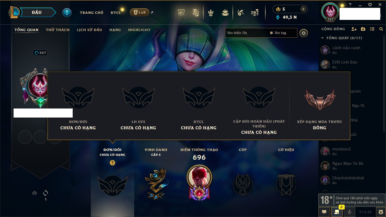 Rank Đơn: Đồng IIIKhung: ĐồngTướng: 169 - Còn 54414 THXTrang Phục: 95Rank ĐTCL: Bạch Kim IVLinh Thú: 112