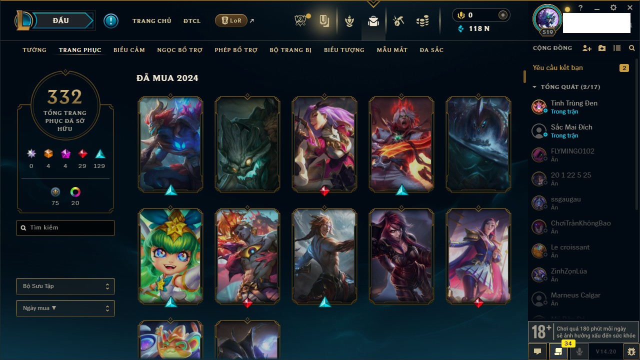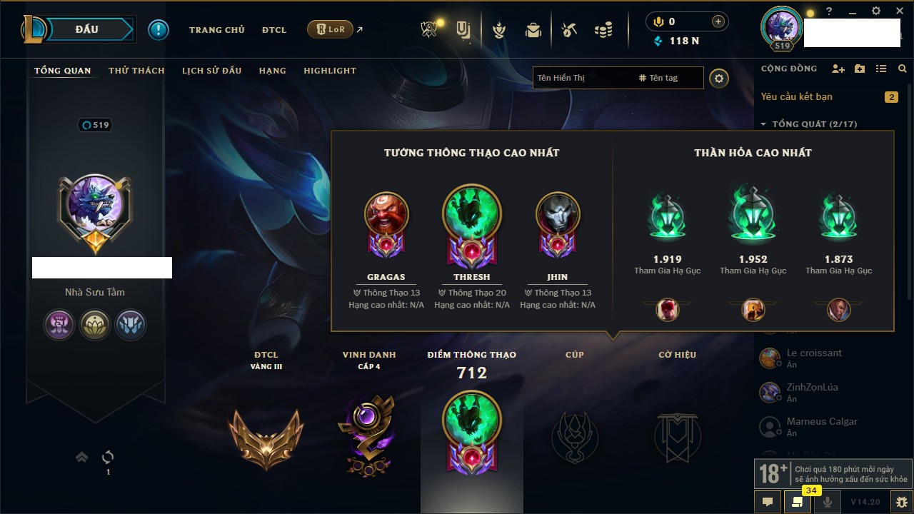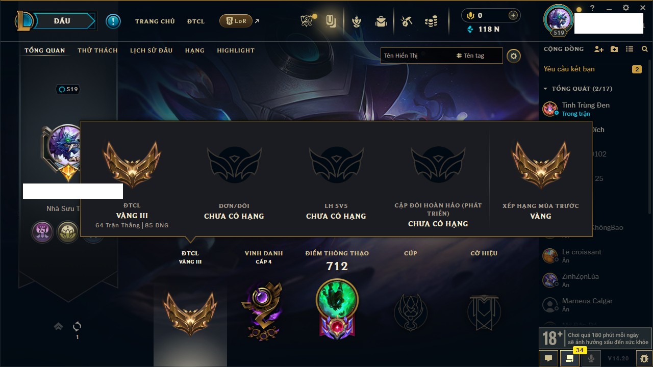 Rank Đơn: Vàng IKhung: Bạch kimTướng: 170 - Còn 212450 THXTrang Phục: 214Rank ĐTCL: Bạch Kim IVLinh Thú: 221