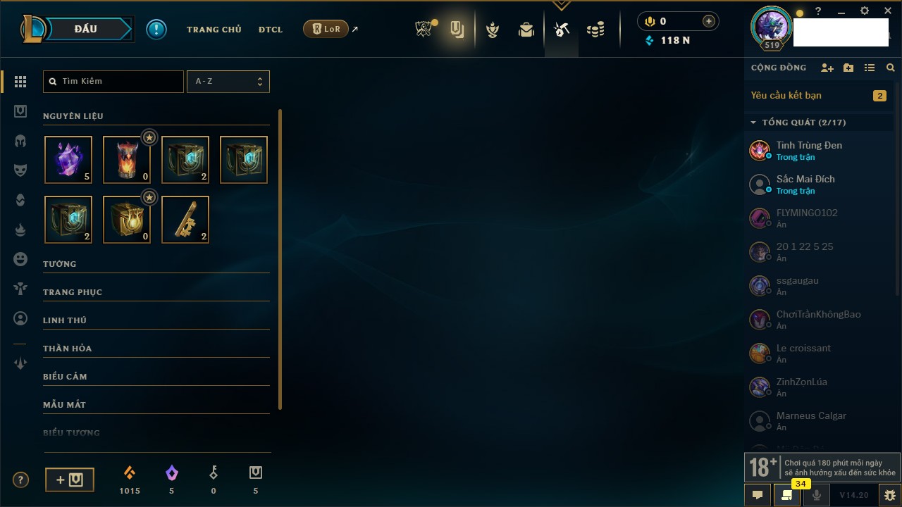 Rank Đơn: Bạch Kim IIIKhung: Bạch kimTướng: 170 - Còn 61079 THXTrang Phục: 352Rank ĐTCL: Sắt IILinh Thú: 70
