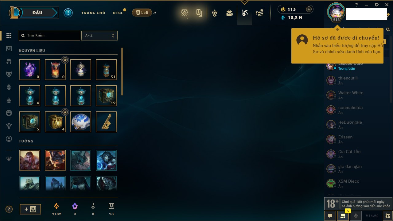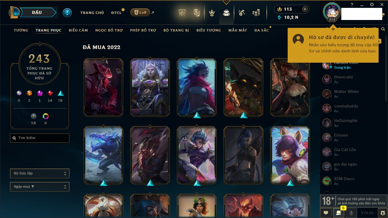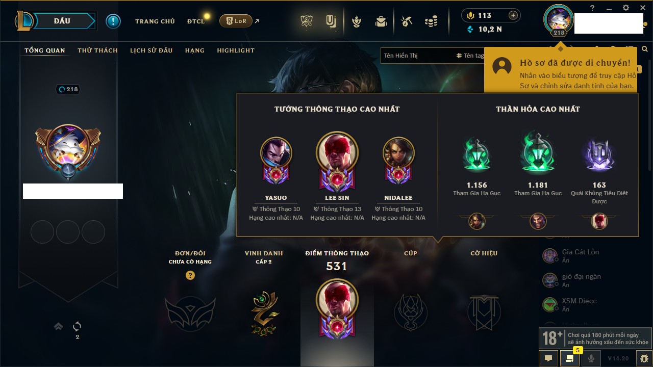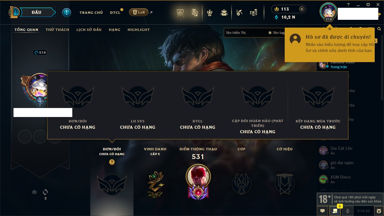 Rank Đơn: Bạc IIIKhung: BạcTướng: 171 - Còn 51045 THXTrang Phục: 220Rank ĐTCL: Sắt IILinh Thú: 141