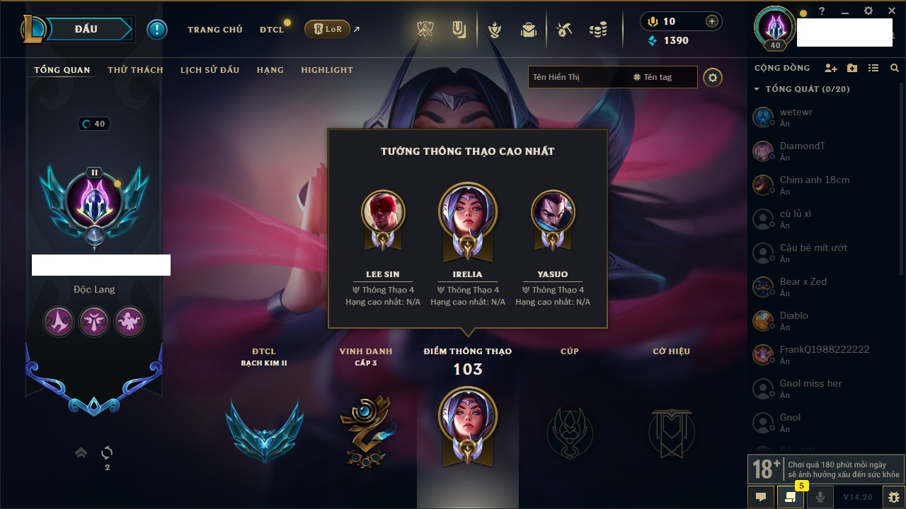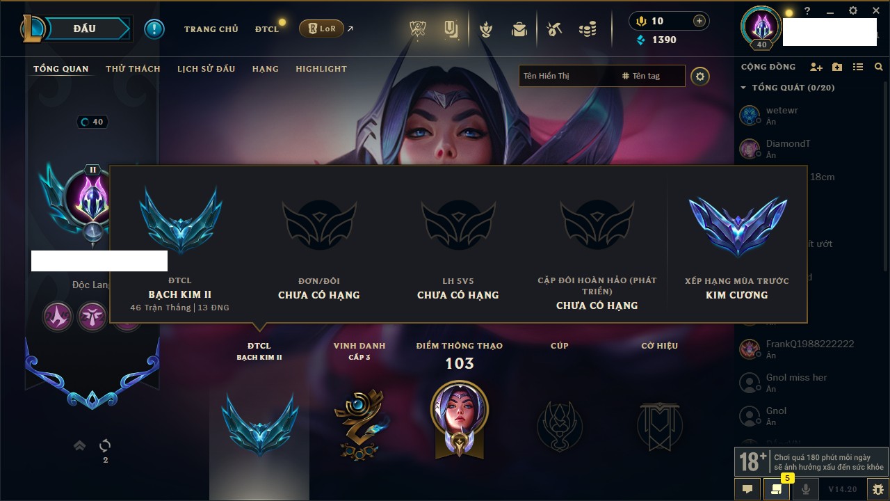 Rank Đơn: Bạc IIKhung: VàngTướng: 171 - Còn 332462 THXTrang Phục: 165Rank ĐTCL: Kim Cương IVLinh Thú: 181