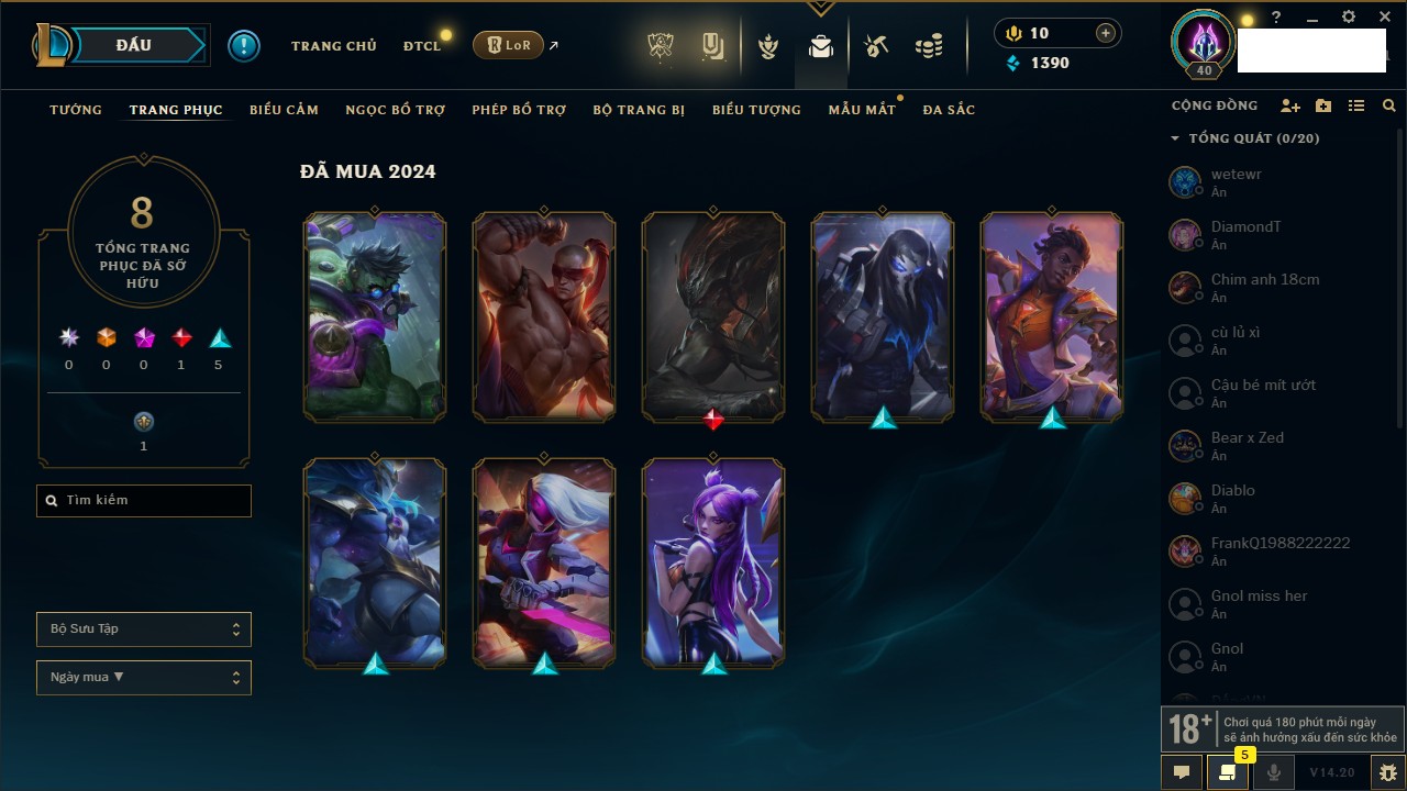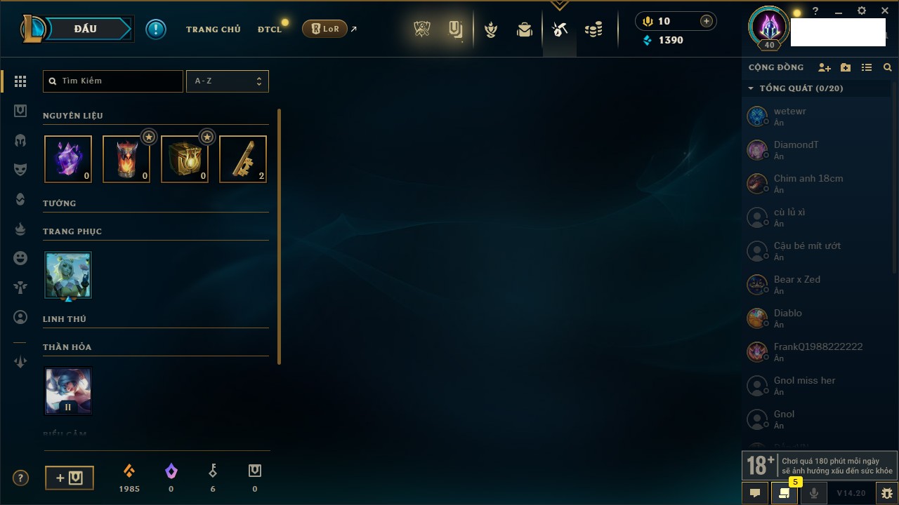 Rank Đơn: Bạc IIKhung: ĐồngTướng: 170 - Còn 62239 THXTrang Phục: 145Rank ĐTCL: Bạch Kim IIILinh Thú: 87