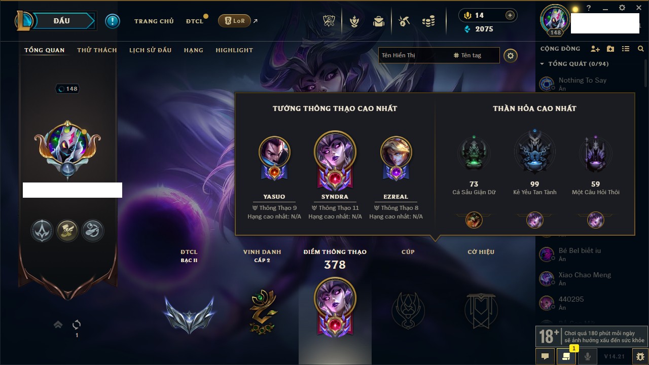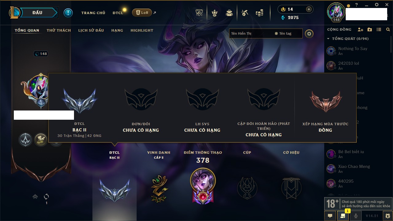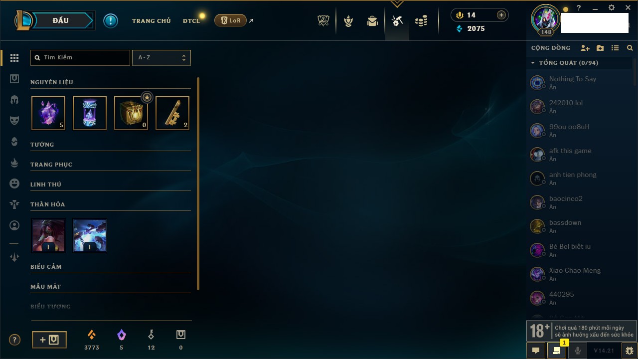 Rank Đơn: Đồng IKhung: Chưa có khungTướng: 130 - Còn 4038 THXTrang Phục: 151Rank ĐTCL: Chưa RankLinh Thú: 45