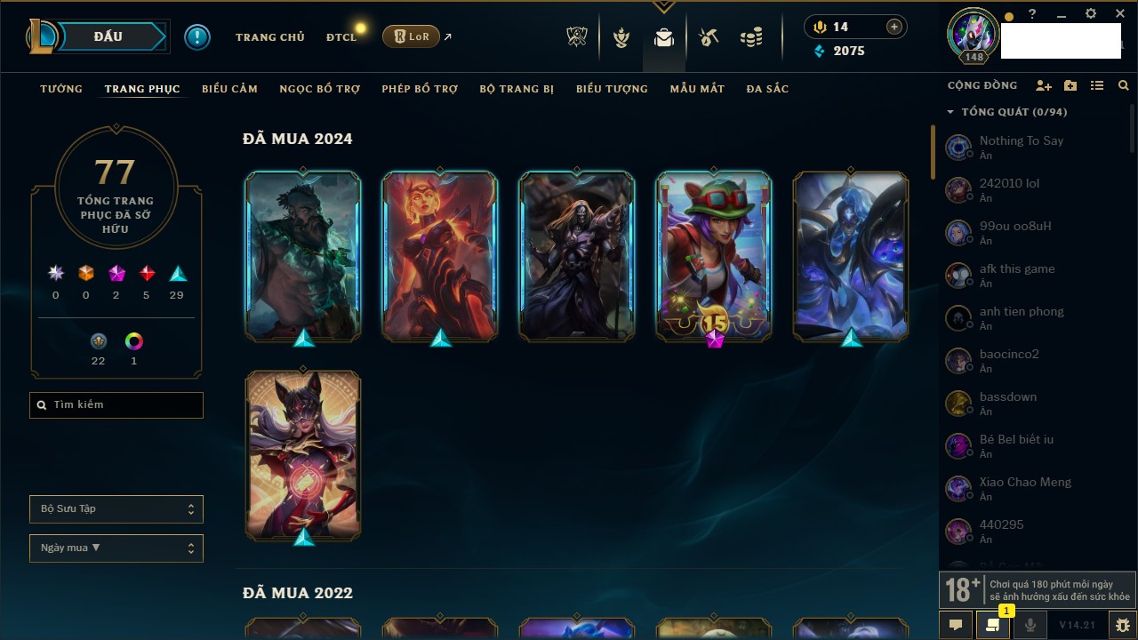 Rank Đơn: Chưa RankKhung: Chưa có khungTướng: 166 - Còn 81290 THXTrang Phục: 69Rank ĐTCL: Chưa RankLinh Thú: 53