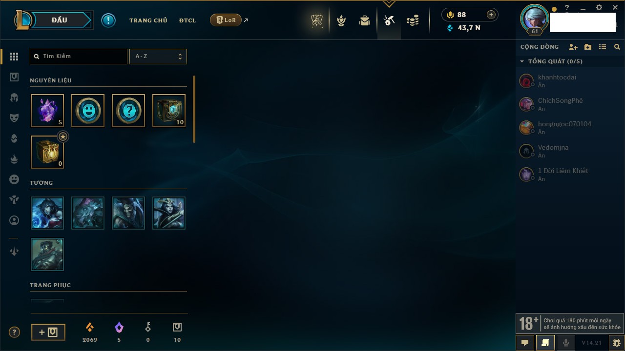 Rank Đơn: Chưa rank mùa nào Khung: Chưa có khung Tướng: 162 - Còn 19578 THX Trang Phục: 28 Rank ĐTCL: Chưa Rank Linh Thú: 141
