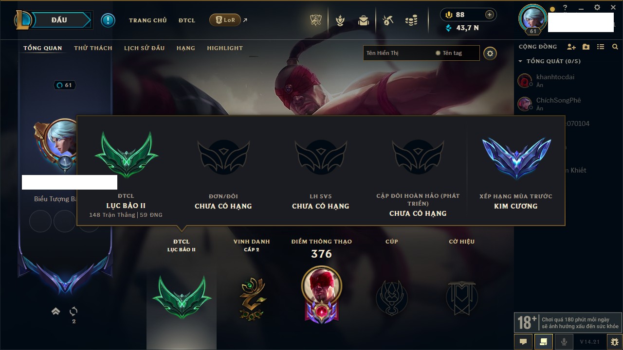 Rank Đơn: Chưa Rank Khung: Chưa có khung Tướng: 105 - Còn 9402 THX Trang Phục: 63 Rank ĐTCL: Chưa Rank Linh Thú: 91