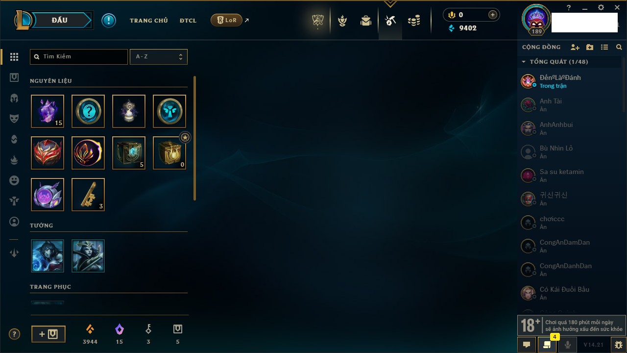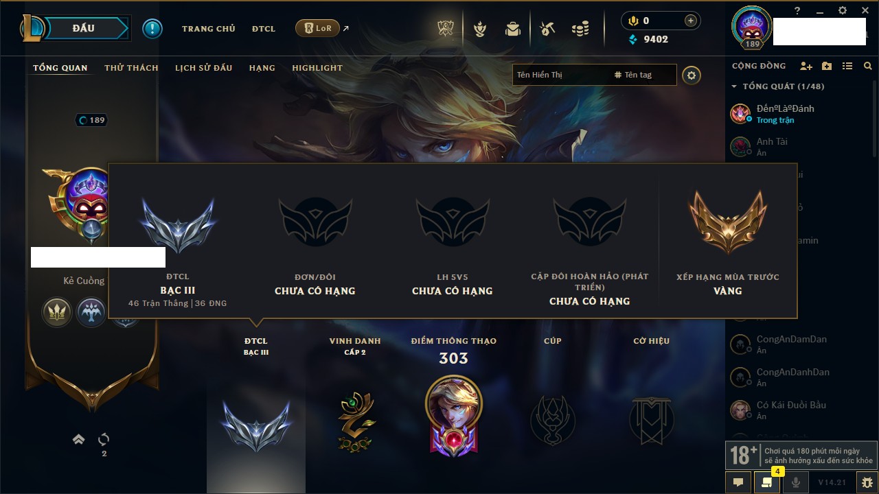 Rank Đơn: Chưa Rank Khung: Chưa có khung Tướng: 105 - Còn 9402 THX Trang Phục: 63 Rank ĐTCL: Chưa Rank Linh Thú: 91