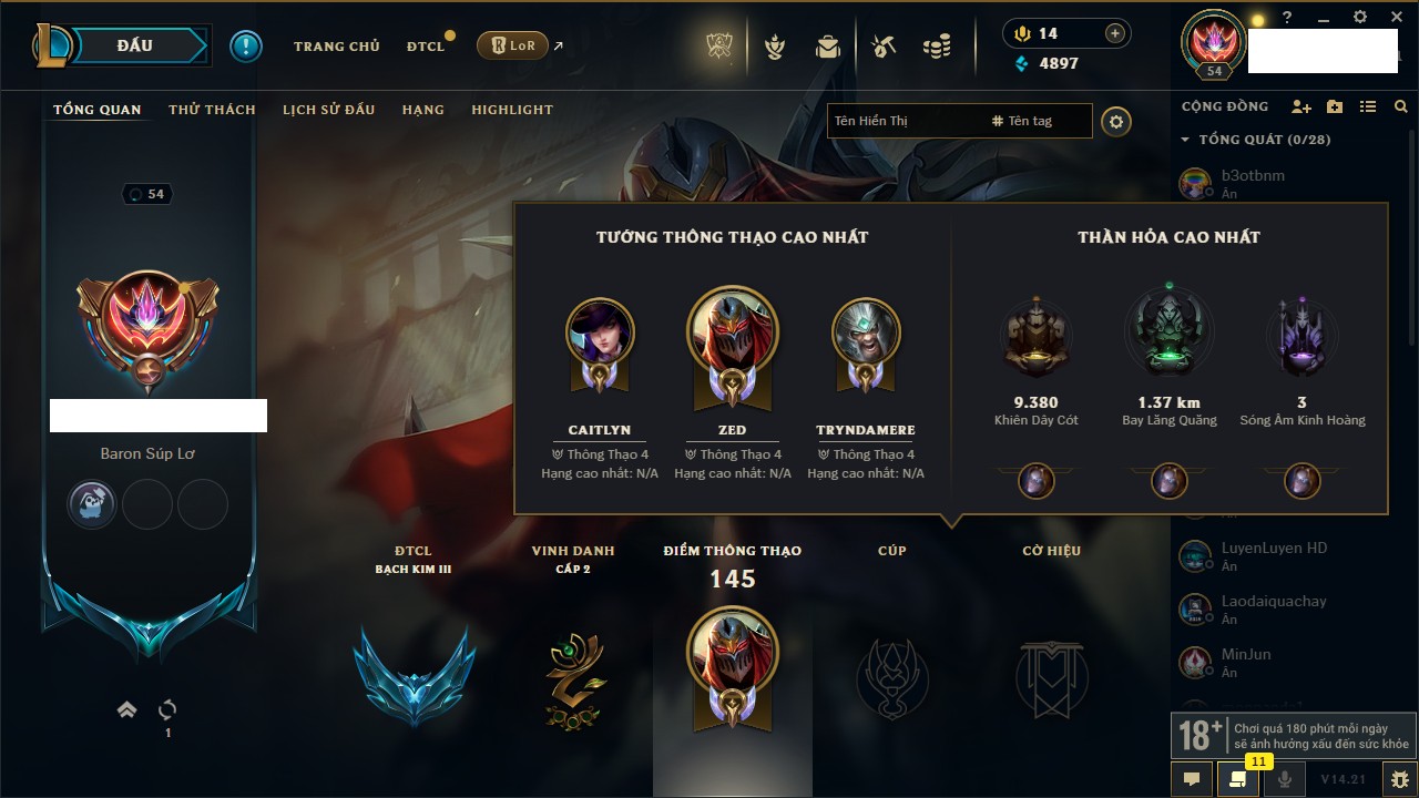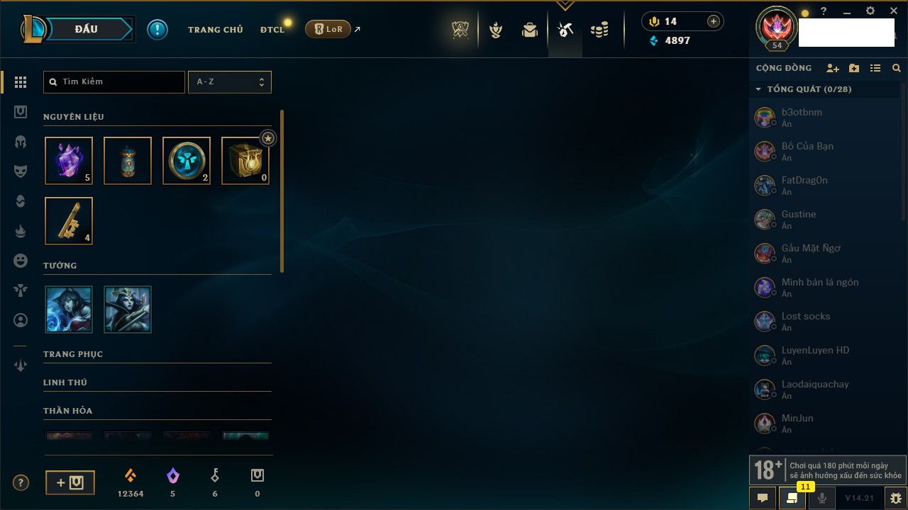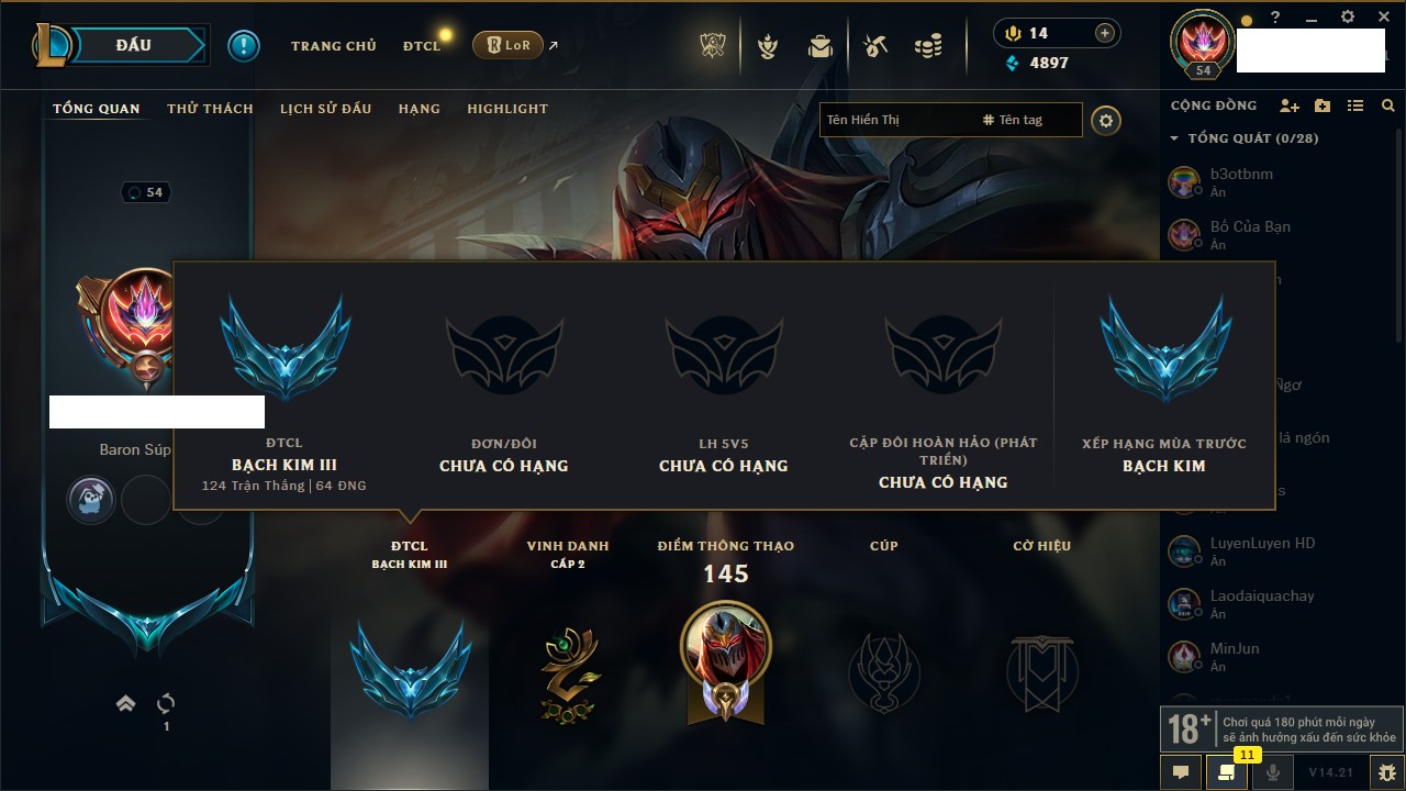 Rank Đơn: Đồng IVKhung: Chưa có khungTướng: 140 - Còn 10800 THXTrang Phục: 19Rank ĐTCL: Chưa RankLinh Thú: 119