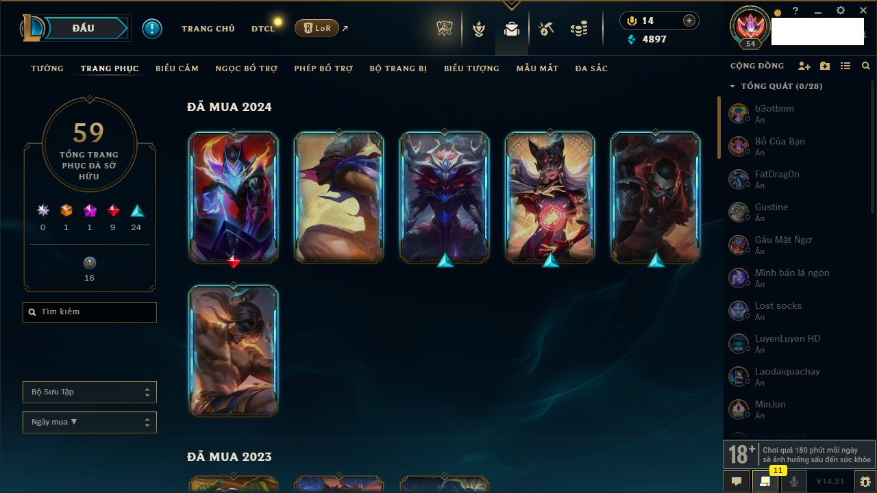 Rank Đơn: Đồng IKhung: Chưa có khungTướng: 171 - Còn 223932 THXTrang Phục: 61Rank ĐTCL: Lục Bảo ILinh Thú: 58