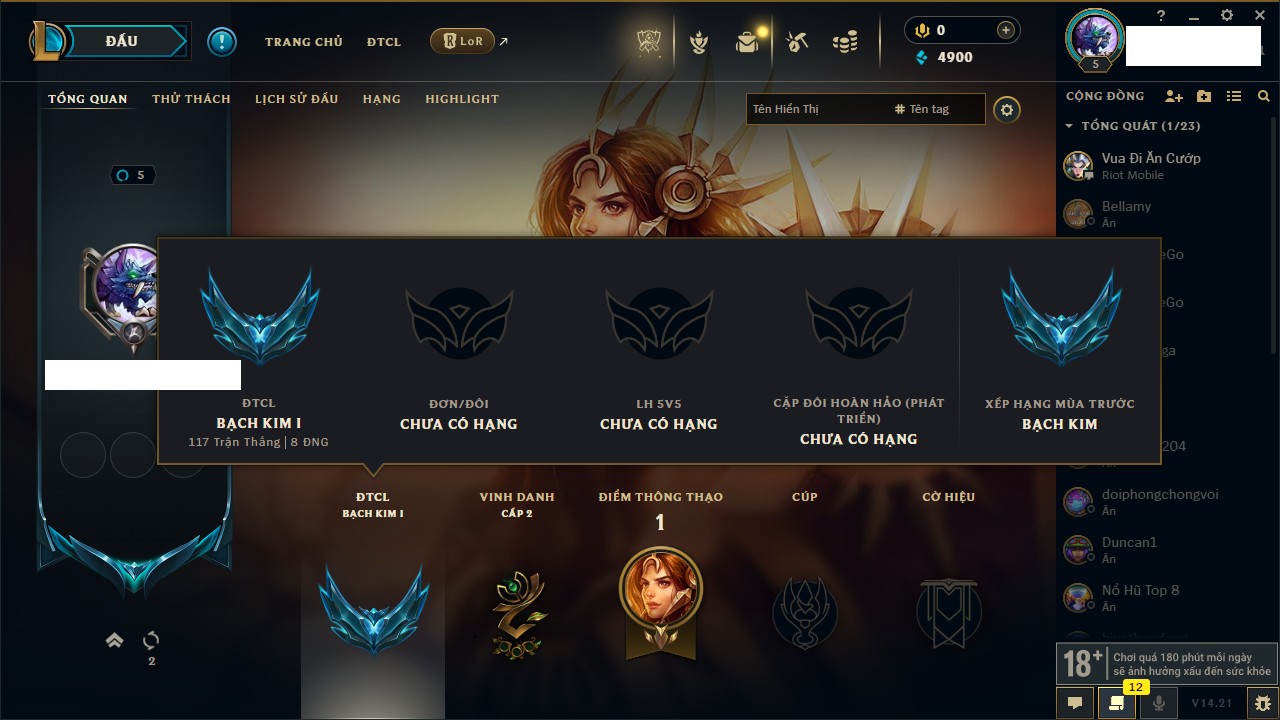 Rank Đơn: Chưa rank mùa nàoKhung: Chưa có khungTướng: 0 - Còn 5500 THXTrang Phục: 0Rank ĐTCL: Vàng IIILinh Thú: 8