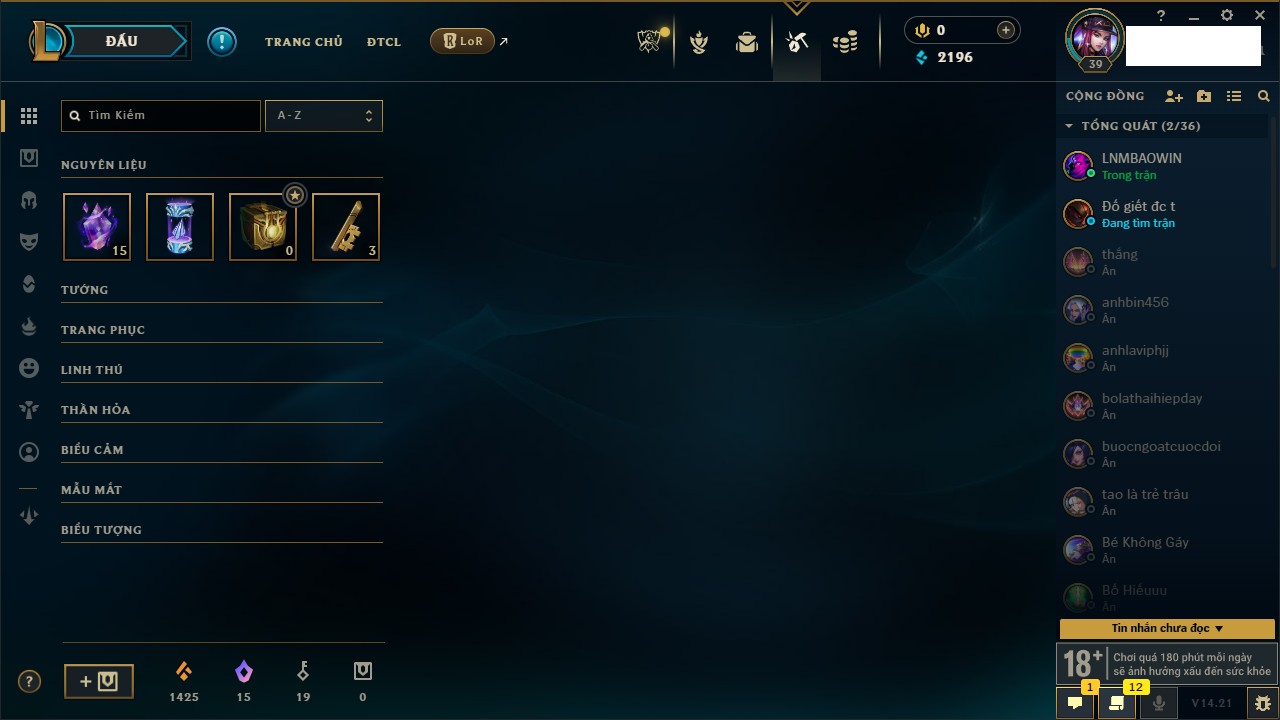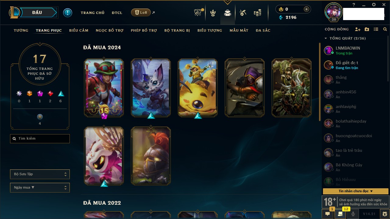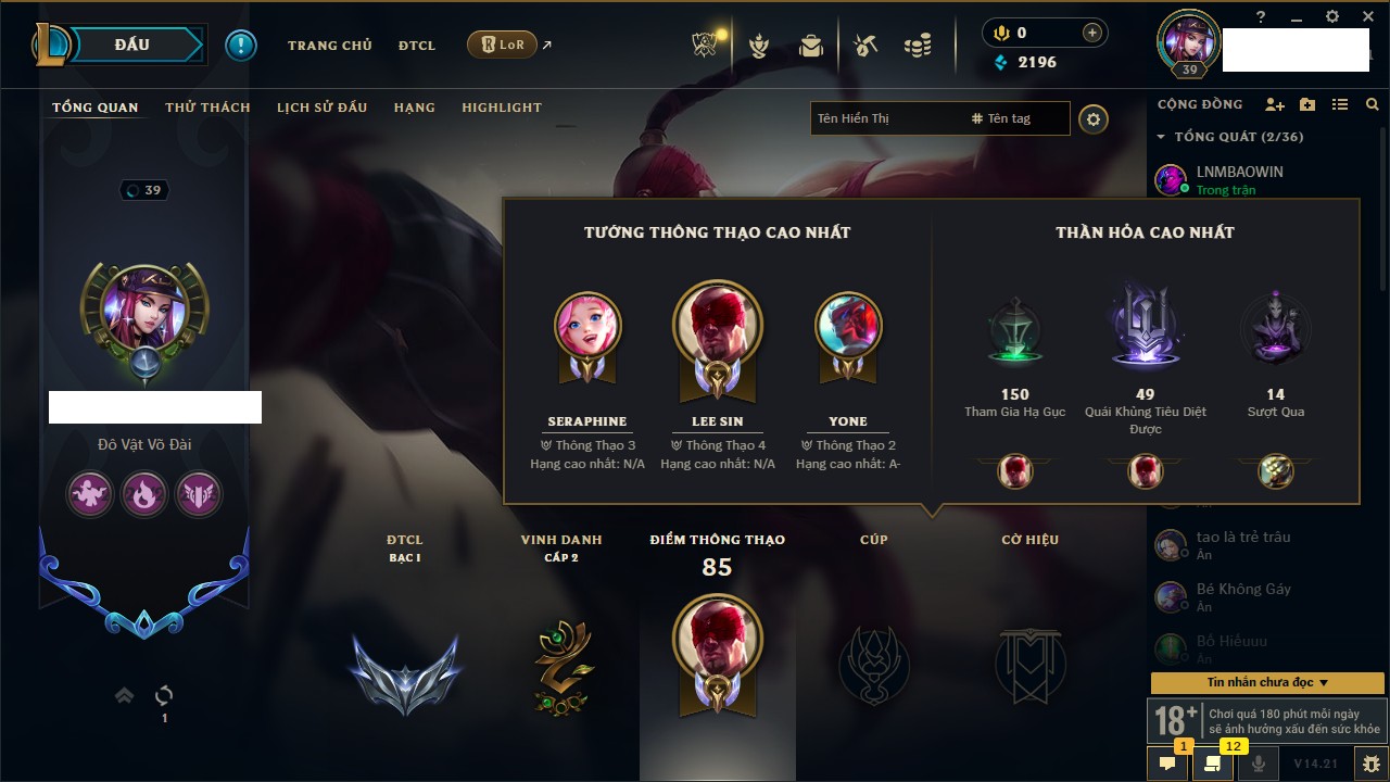 Rank Đơn: Chưa rank mùa nàoKhung: Chưa có khungTướng: 62 - Còn 2196 THXTrang Phục: 17Rank ĐTCL: Chưa RankLinh Thú: 88