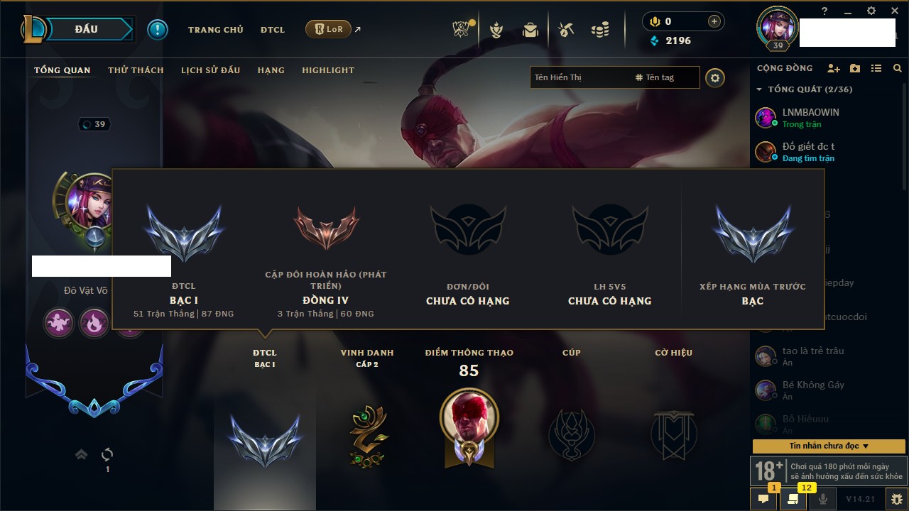 Rank Đơn: Chưa rank mùa nàoKhung: Chưa có khungTướng: 38 - Còn 6280 THXTrang Phục: 2Rank ĐTCL: Chưa RankLinh Thú: 50