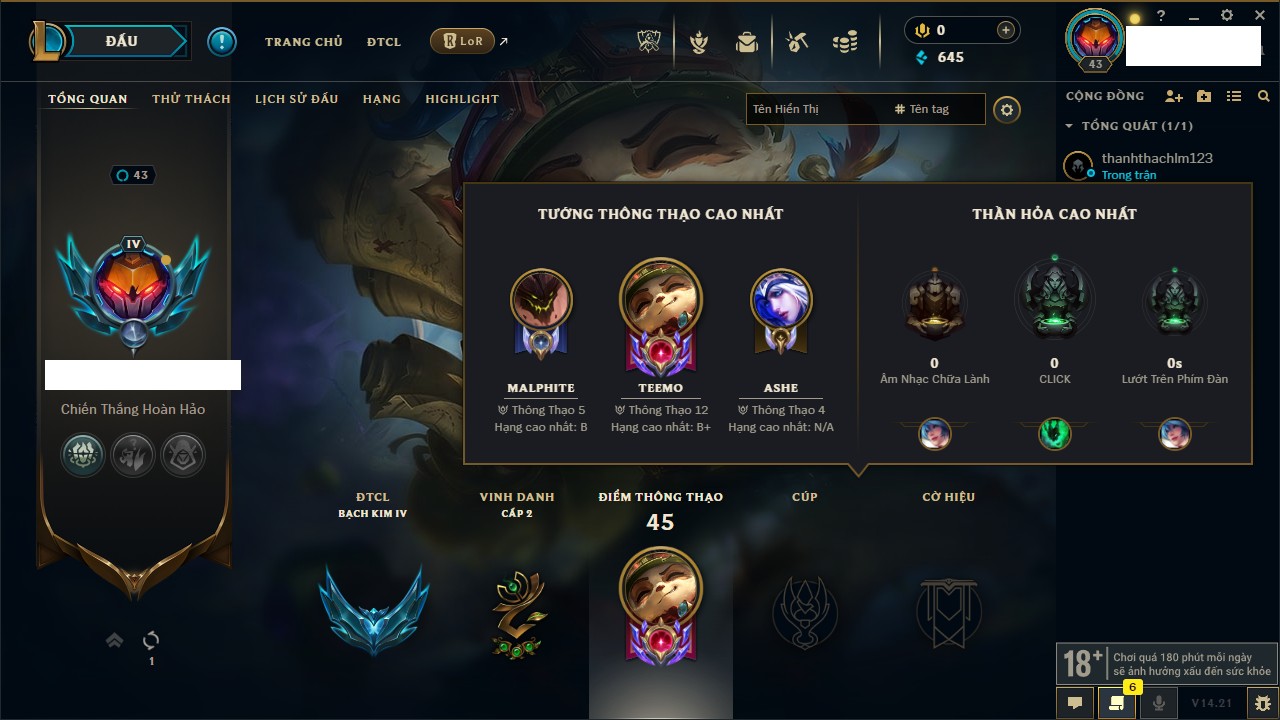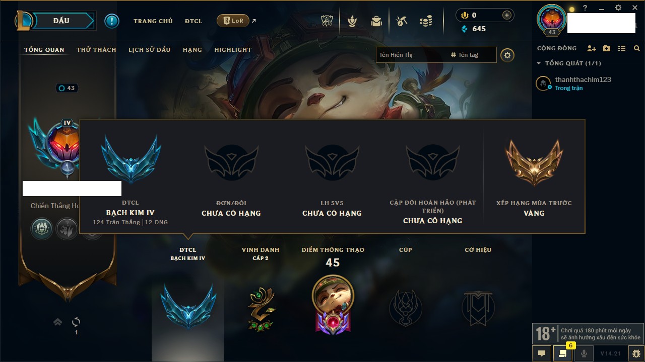 Rank Đơn: Chưa rank mùa nàoKhung: Chưa có khungTướng: 38 - Còn 6280 THXTrang Phục: 2Rank ĐTCL: Chưa RankLinh Thú: 50