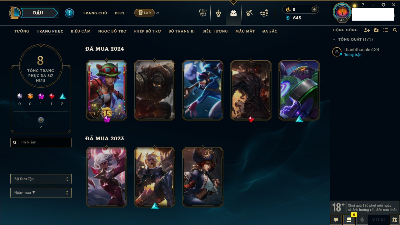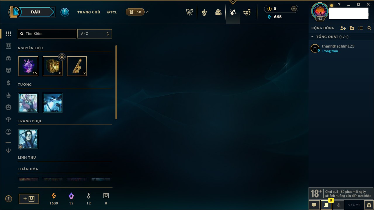 Rank Đơn: Chưa rank mùa nàoKhung: Chưa có khungTướng: 147 - Còn 13200 THXTrang Phục: 0Rank ĐTCL: Chưa RankLinh Thú: 2