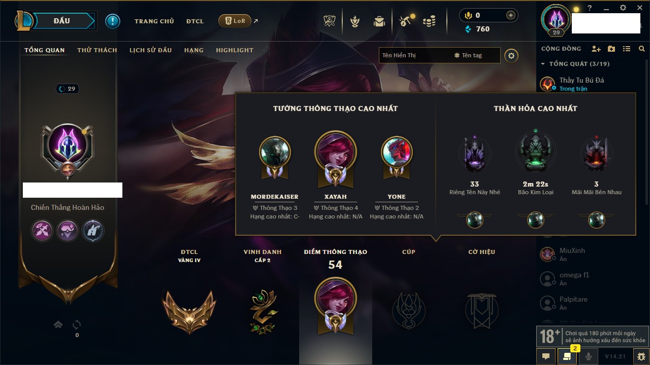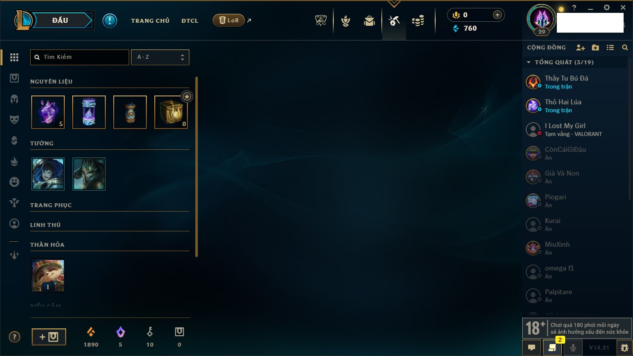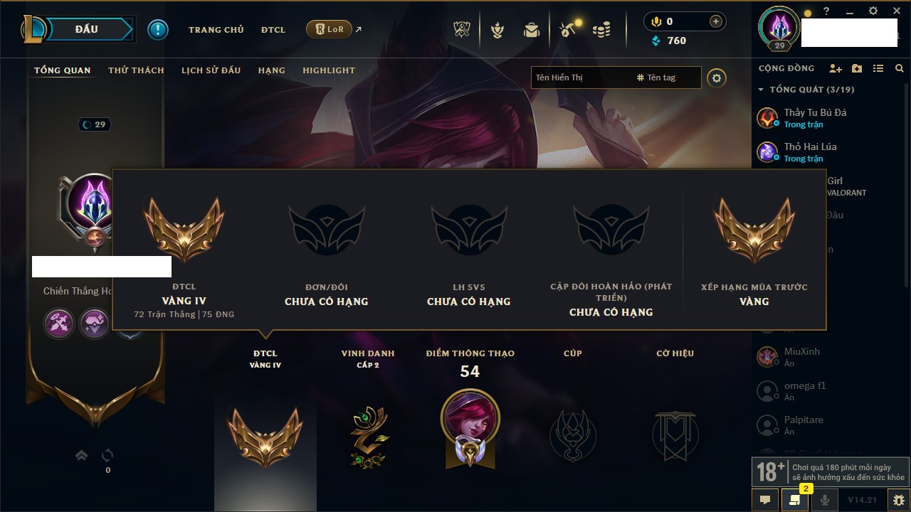 Rank Đơn: Chưa rank mùa nàoKhung: Chưa có khungTướng: 38 - Còn 6280 THXTrang Phục: 2Rank ĐTCL: Chưa RankLinh Thú: 50