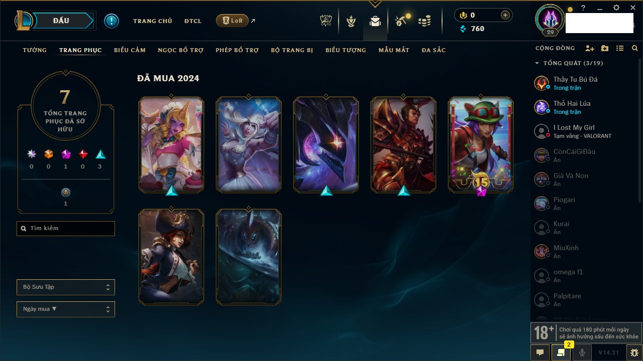 Rank Đơn: Chưa rank mùa nàoKhung: Chưa có khungTướng: 62 - Còn 2196 THXTrang Phục: 17Rank ĐTCL: Chưa RankLinh Thú: 88