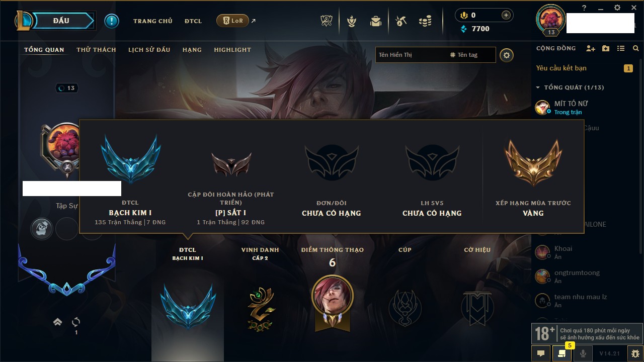 Rank Đơn: Chưa rank mùa nàoKhung: Chưa có khungTướng: 21 - Còn 4695 THXTrang Phục: 1Rank ĐTCL: Chưa RankLinh Thú: 7