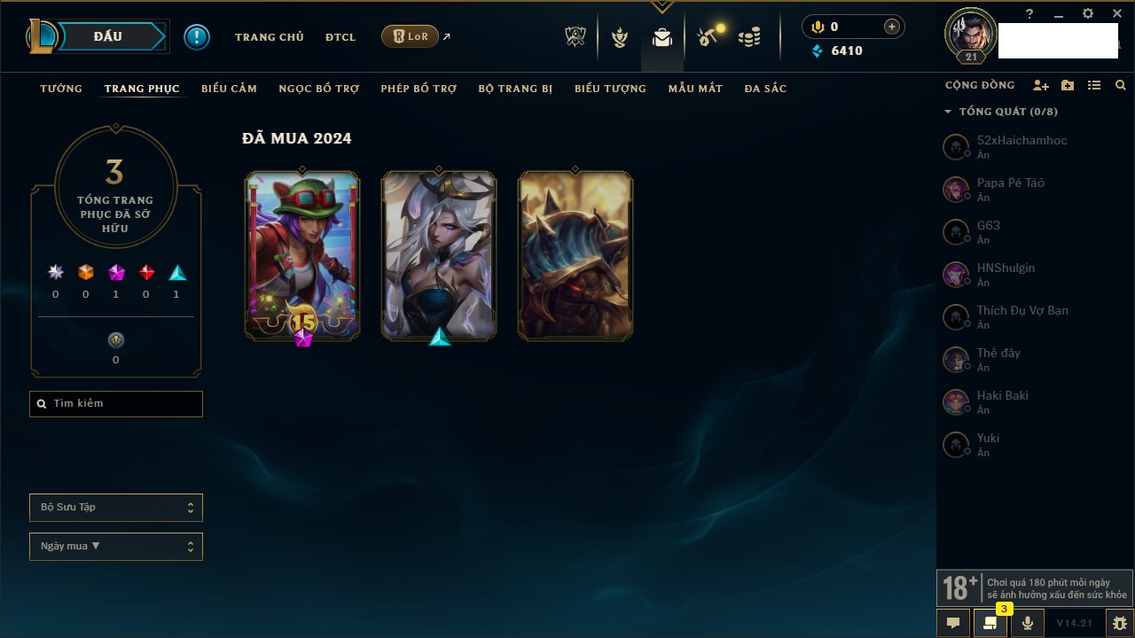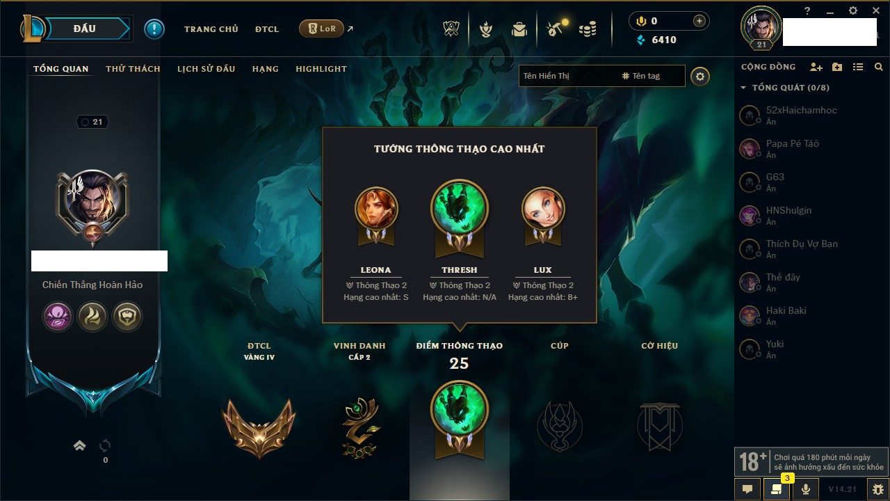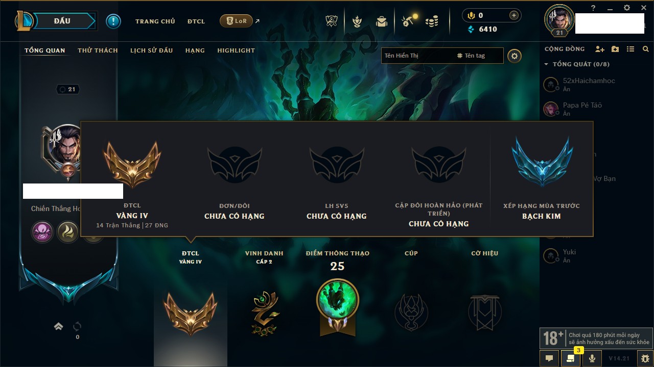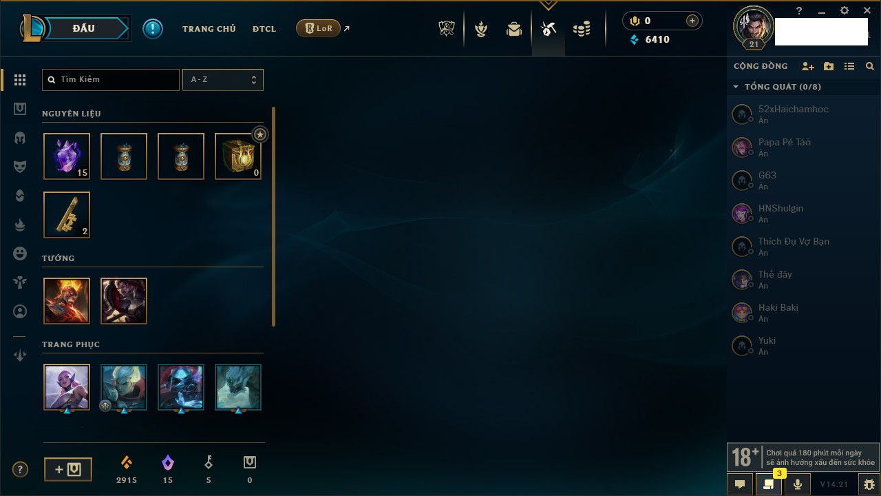 Rank Đơn: Sắt IIIKhung: Chưa có khungTướng: 63 - Còn 185 THXTrang Phục: 8Rank ĐTCL: Chưa RankLinh Thú: 75